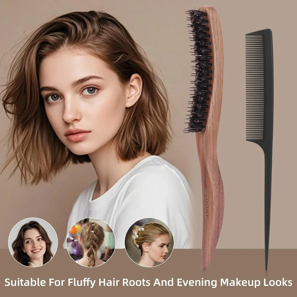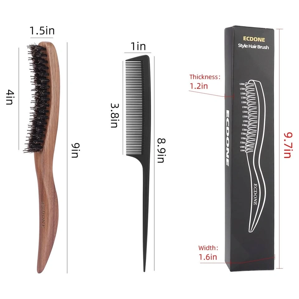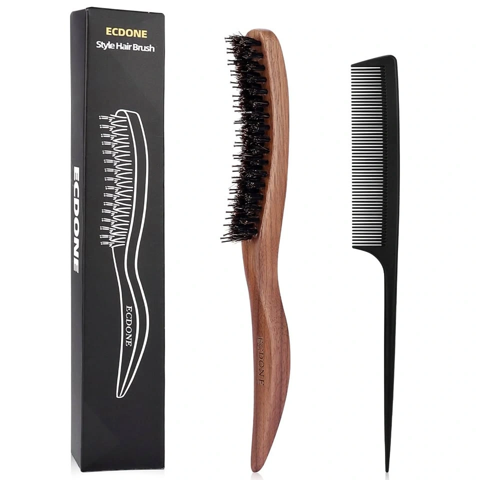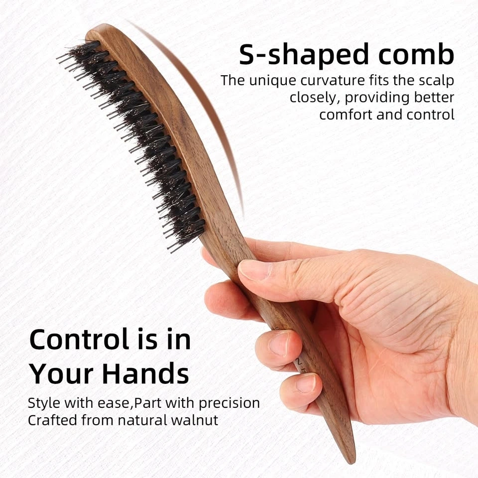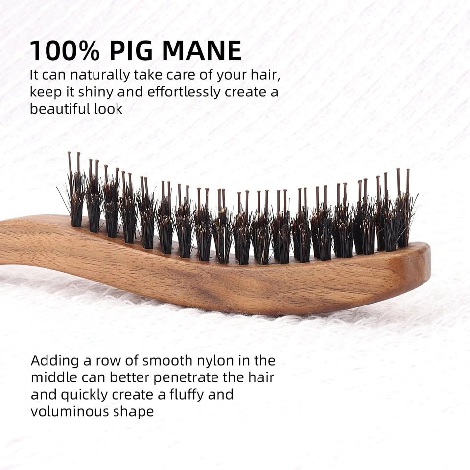 New ECDONE hair brush and comb set! This S-shaped brush is crafted from natural walnut wood and has 100% pig mane bristles. It also has a row of smooth nylon bristles in the middle, great for getting into hair and adding volume. Comes with a black comb too. Perfect for everyday styling, fluffy roots, or those fancy evening looks.