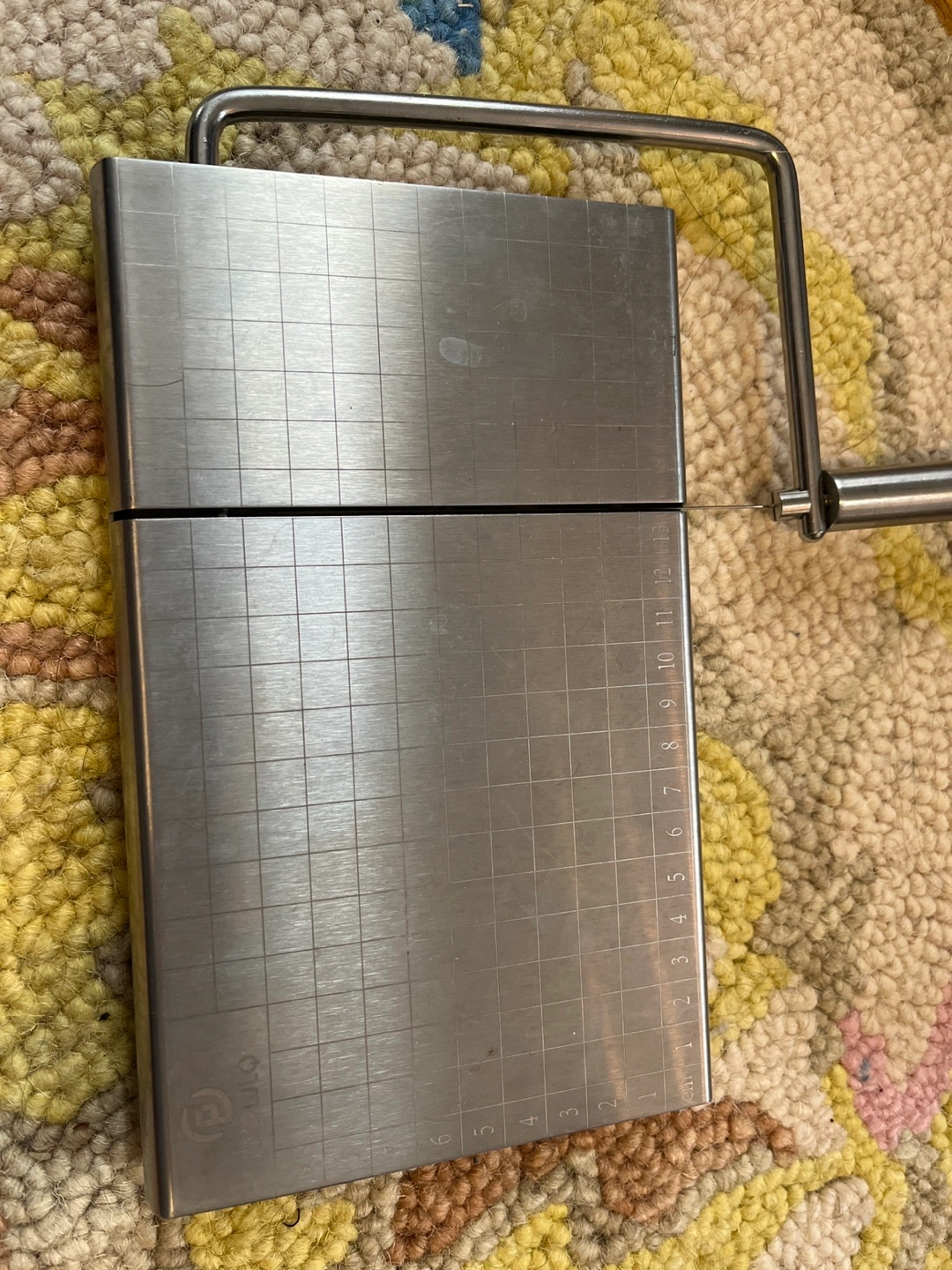 Stainless steel cheese slicer. Gridded surface for precise slicing. Includes wire cutter replacements. Easy to clean.
