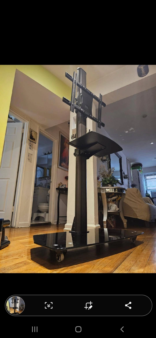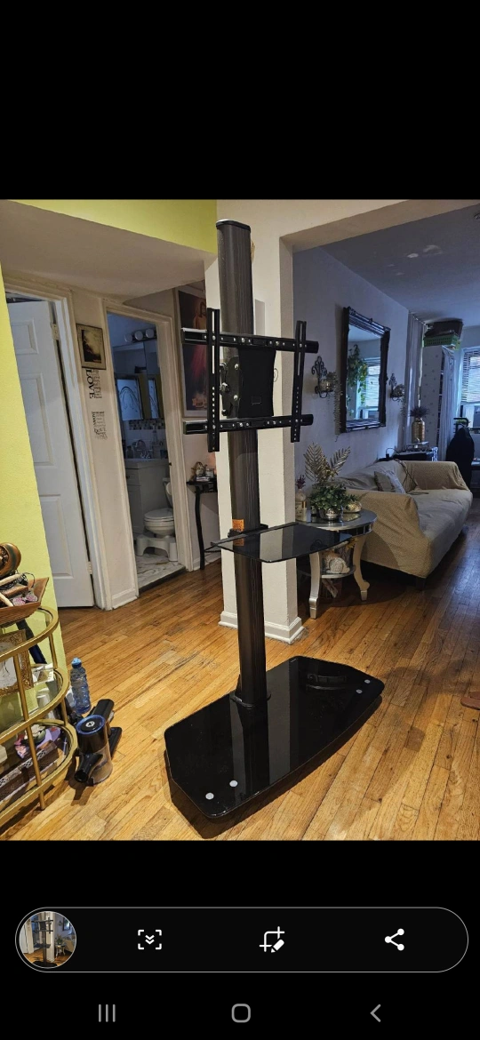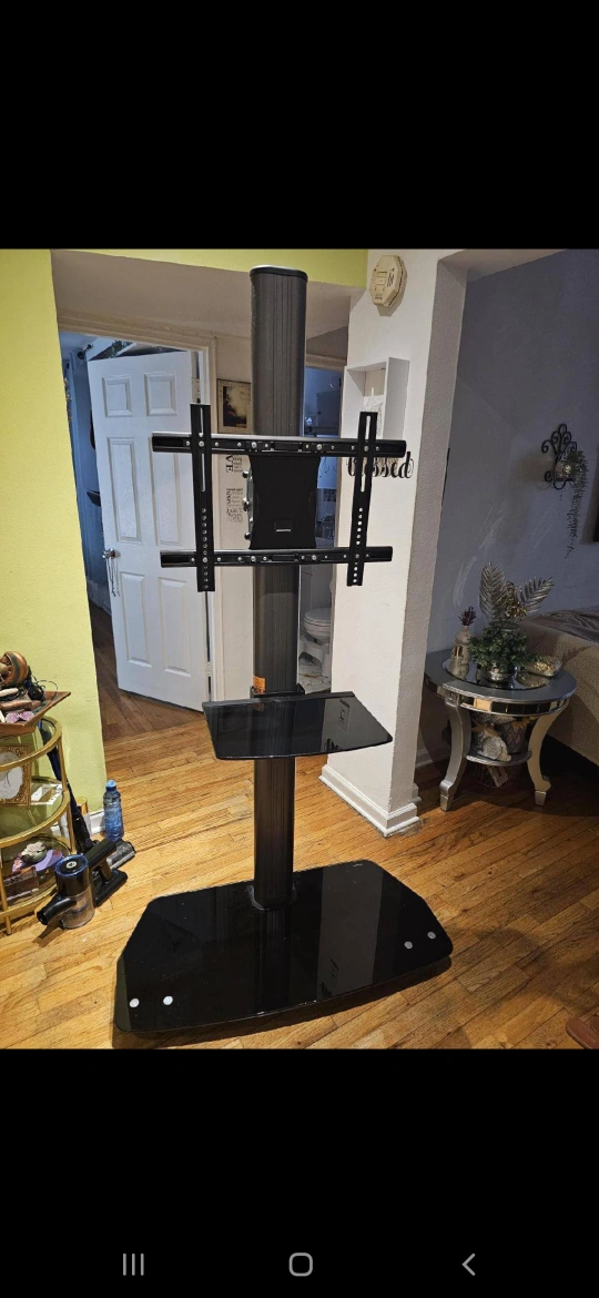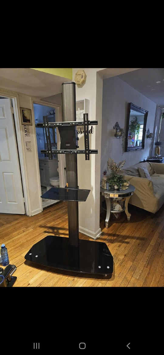 Selling a universal swivel floor TV stand in black. It features a sleek design with a glass base and shelf. Perfect for any living room or entertainment area!