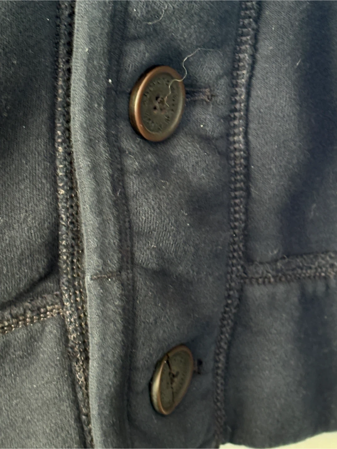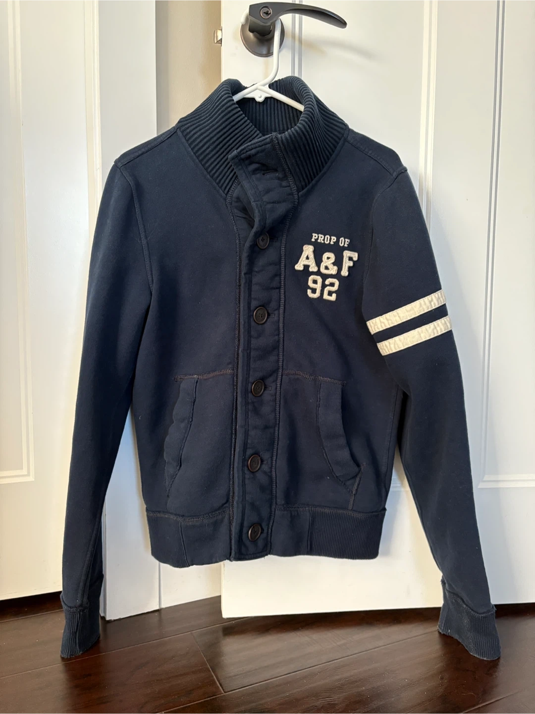 Selling a gently used Abercrombie & Fitch jacket in navy blue. It's a size small and features a button-up front with a ribbed collar and cuffs. It also has sporty stripes on the sleeves. Perfect for layering!
