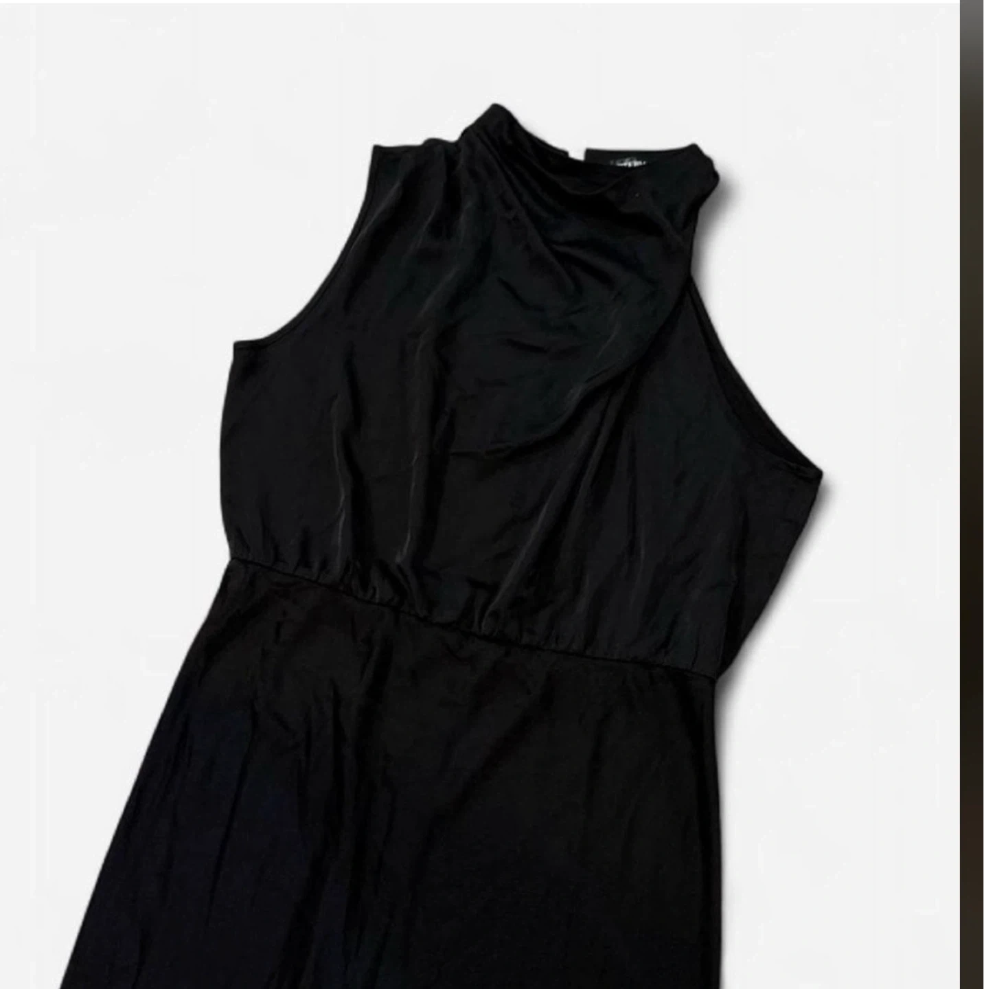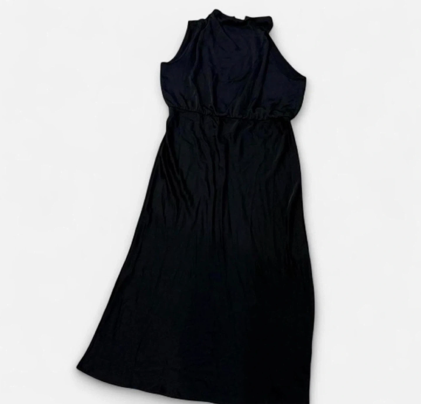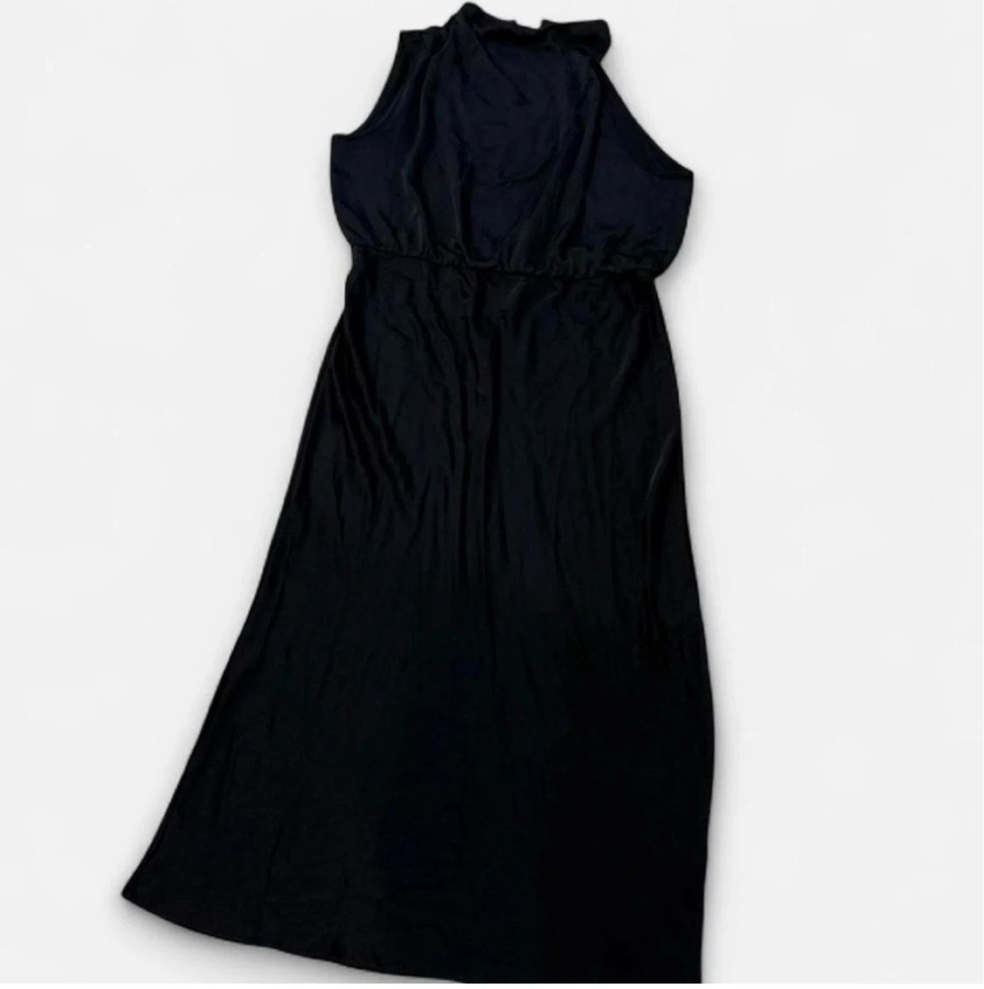 Beautiful Sleeveless black maxi dress with a high neckline. Elasticized waist. Fabric appears to be a polyester blend. New Tag missing
