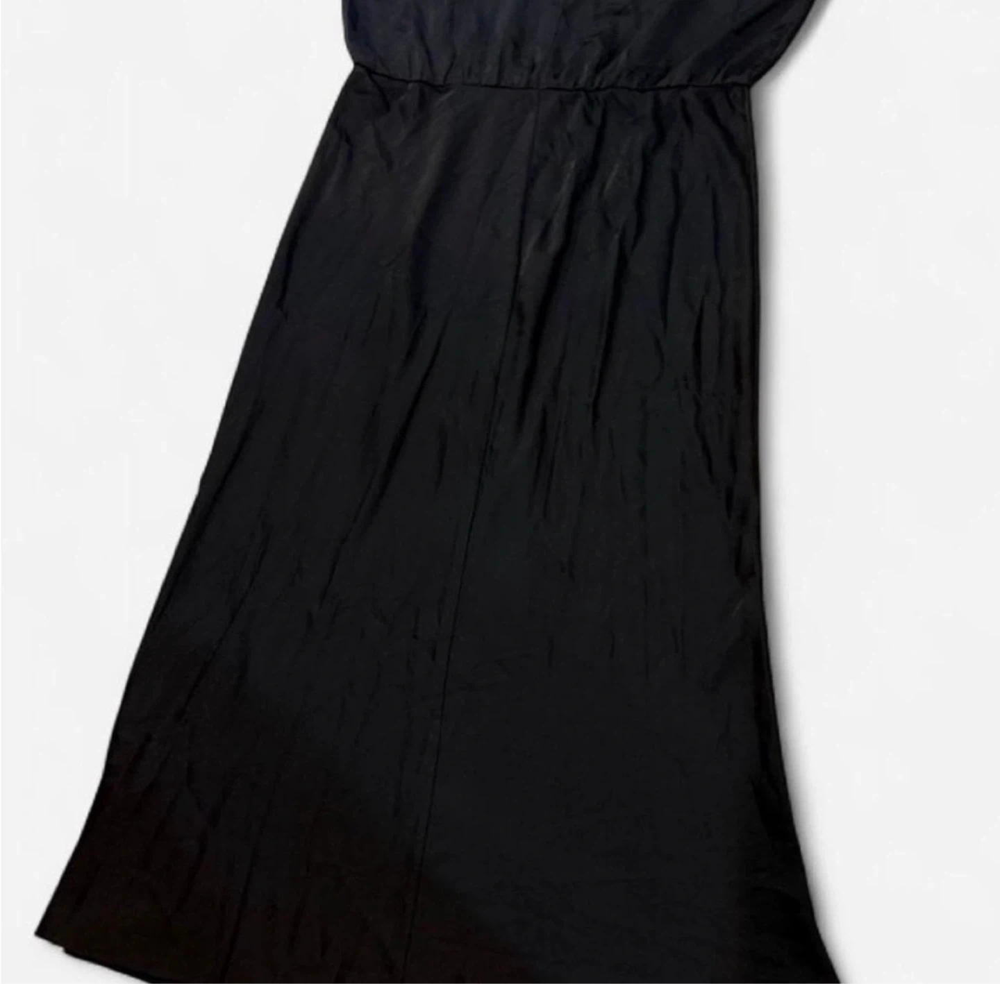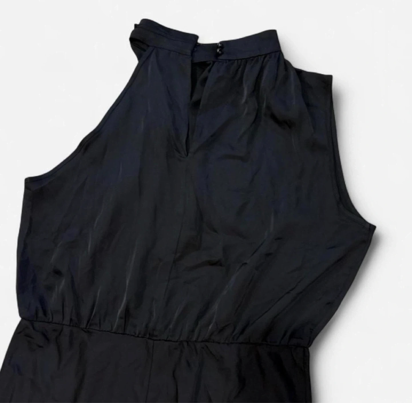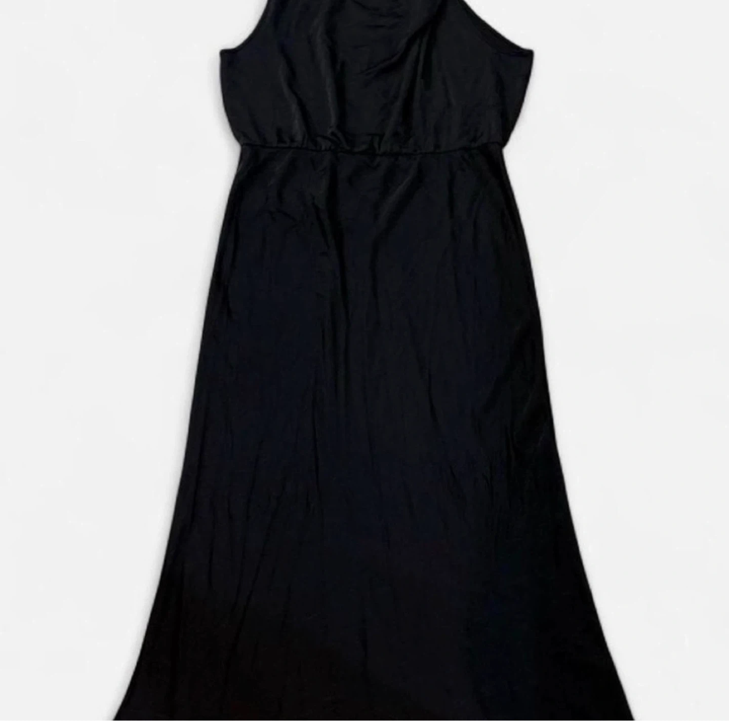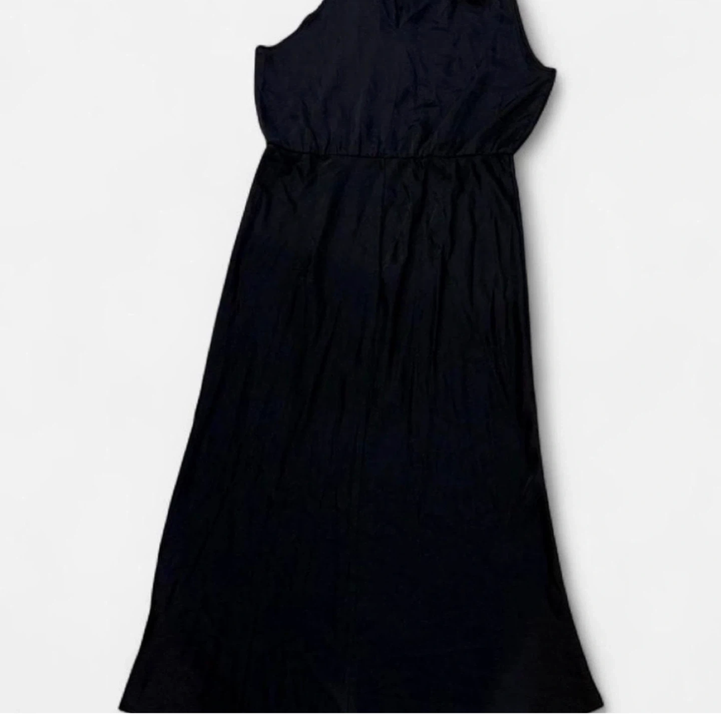 Beautiful Sleeveless black maxi dress with a high neckline. Elasticized waist. Fabric appears to be a polyester blend. New Tag missing
