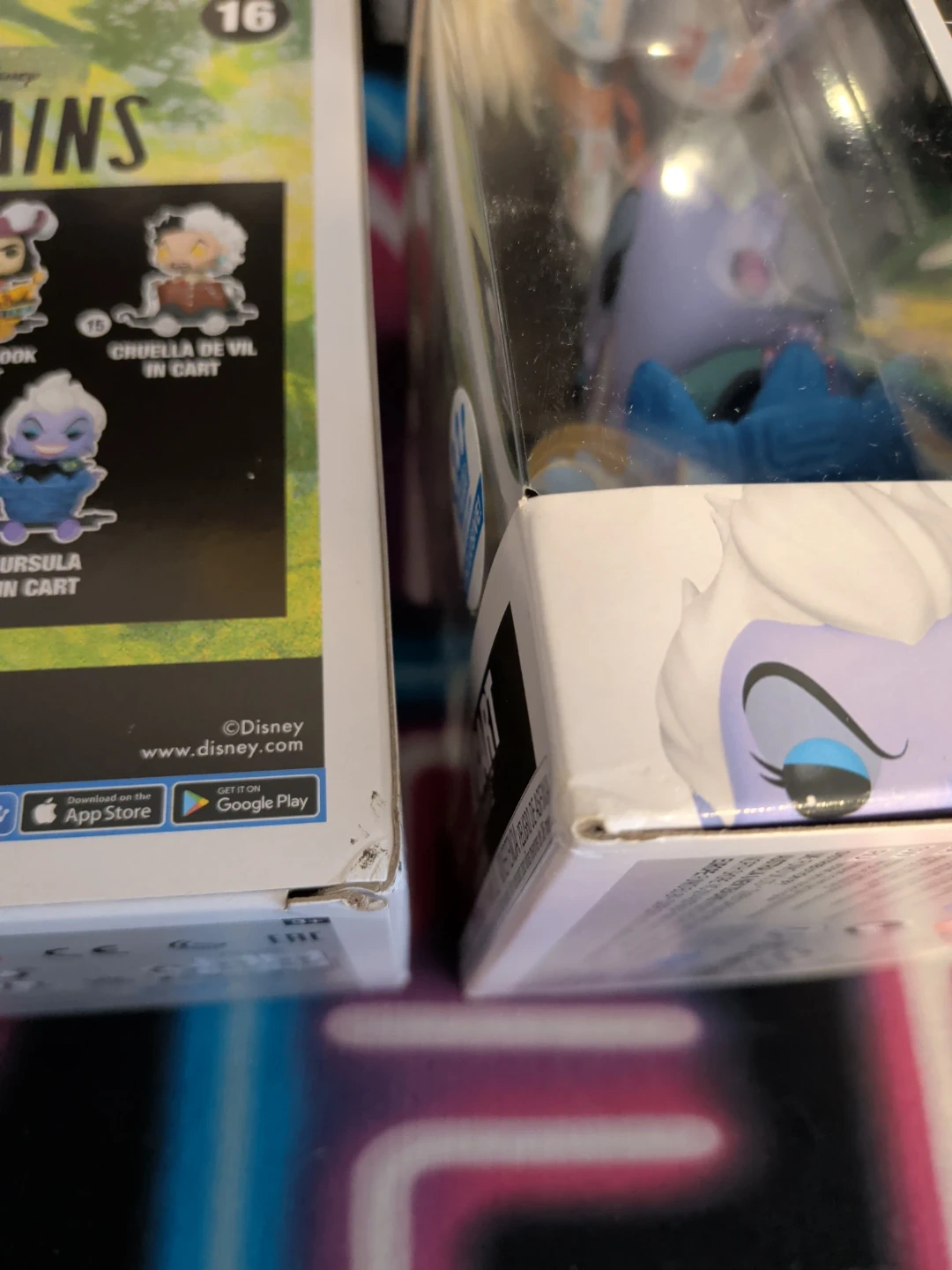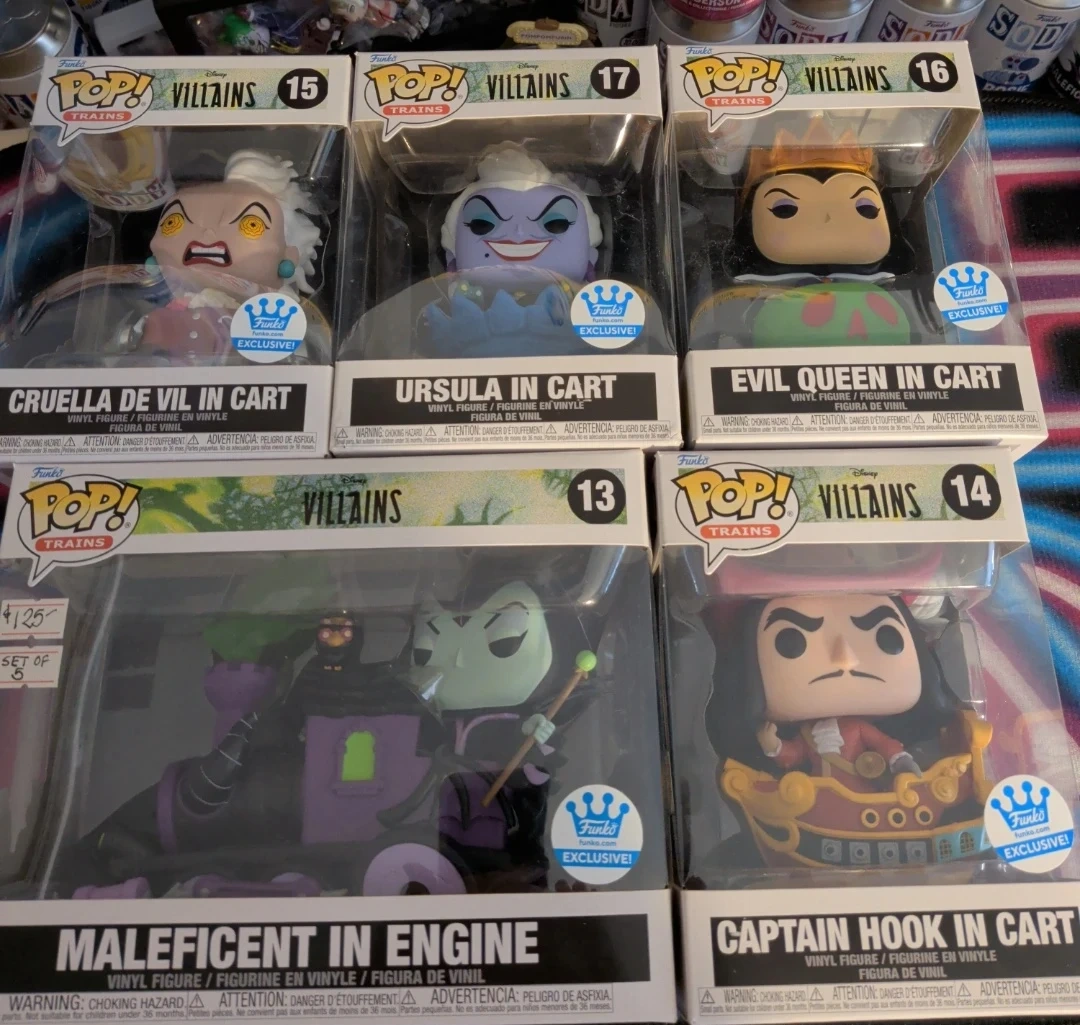 This set includes five Funko Pop! Disney Villains figures: Cruella de Vil, Ursula, Evil Queen, Maleficent, and Captain Hook. All figures are vinyl and come in their original boxes. Clean, good condition. See 2nd photo for the small dings on box.