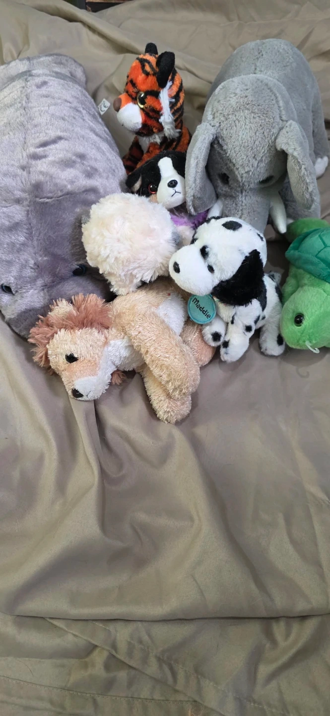 Assortment of soft plush stuffed animals. Includes a spotted dog with a name tag, an elephant, a tiger, a turtle, a lion, and a large grey seal.