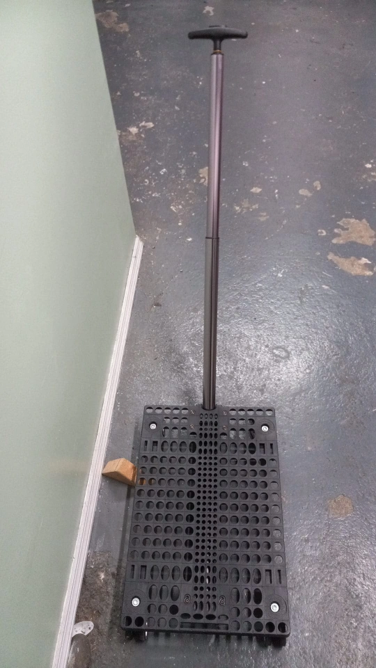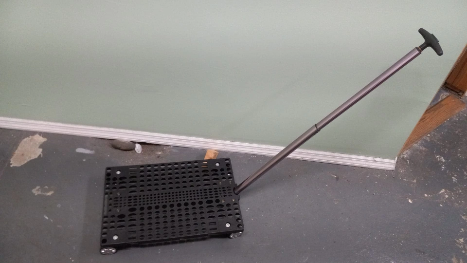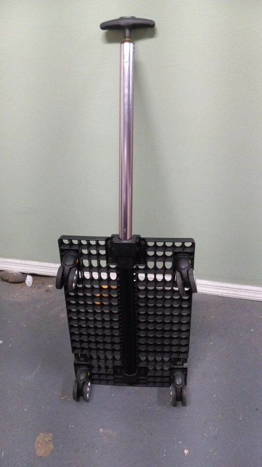 This is a black folding luggage cart dolly with a telescoping handle and wheels. It's designed for easy transport of heavy items. The base has a grid pattern for securing loads.