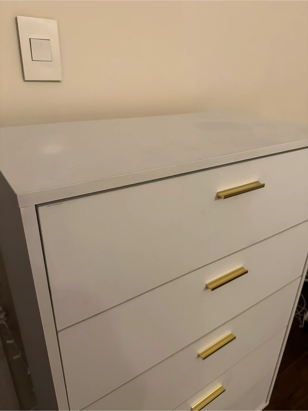 It features sleek gold handles and a modern design. Perfect for adding storage and style to any bedroom or living space. There are some minor signs of use on the top surface.