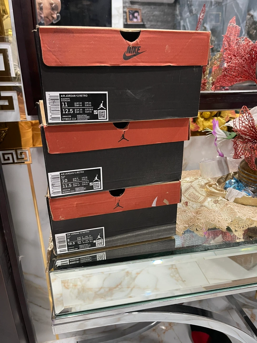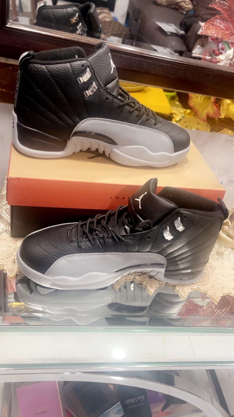Classic black and grey Air Jordan 12 "Playoffs" sneakers. Features a leather and synthetic upper with iconic Jumpman branding. Includes original box.