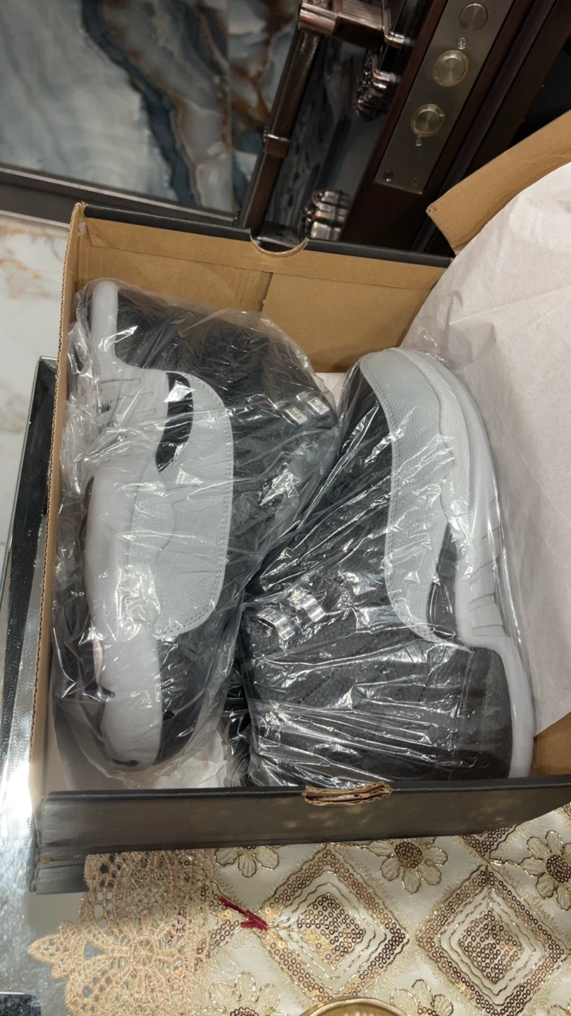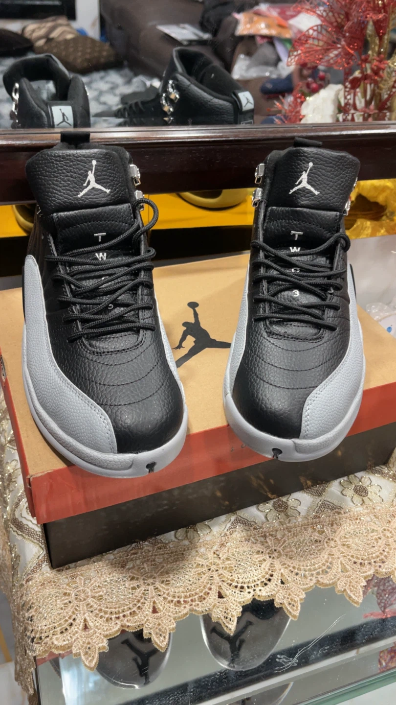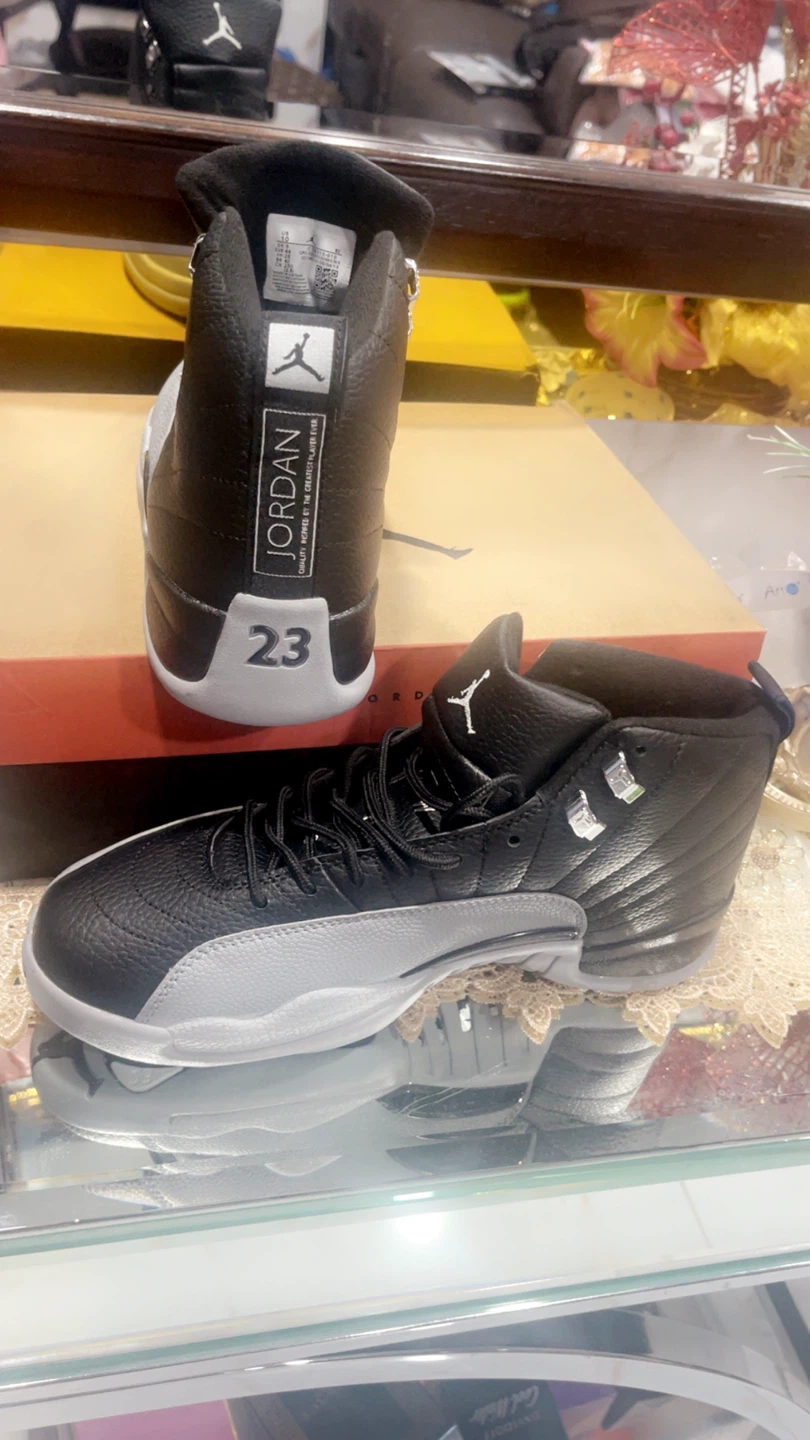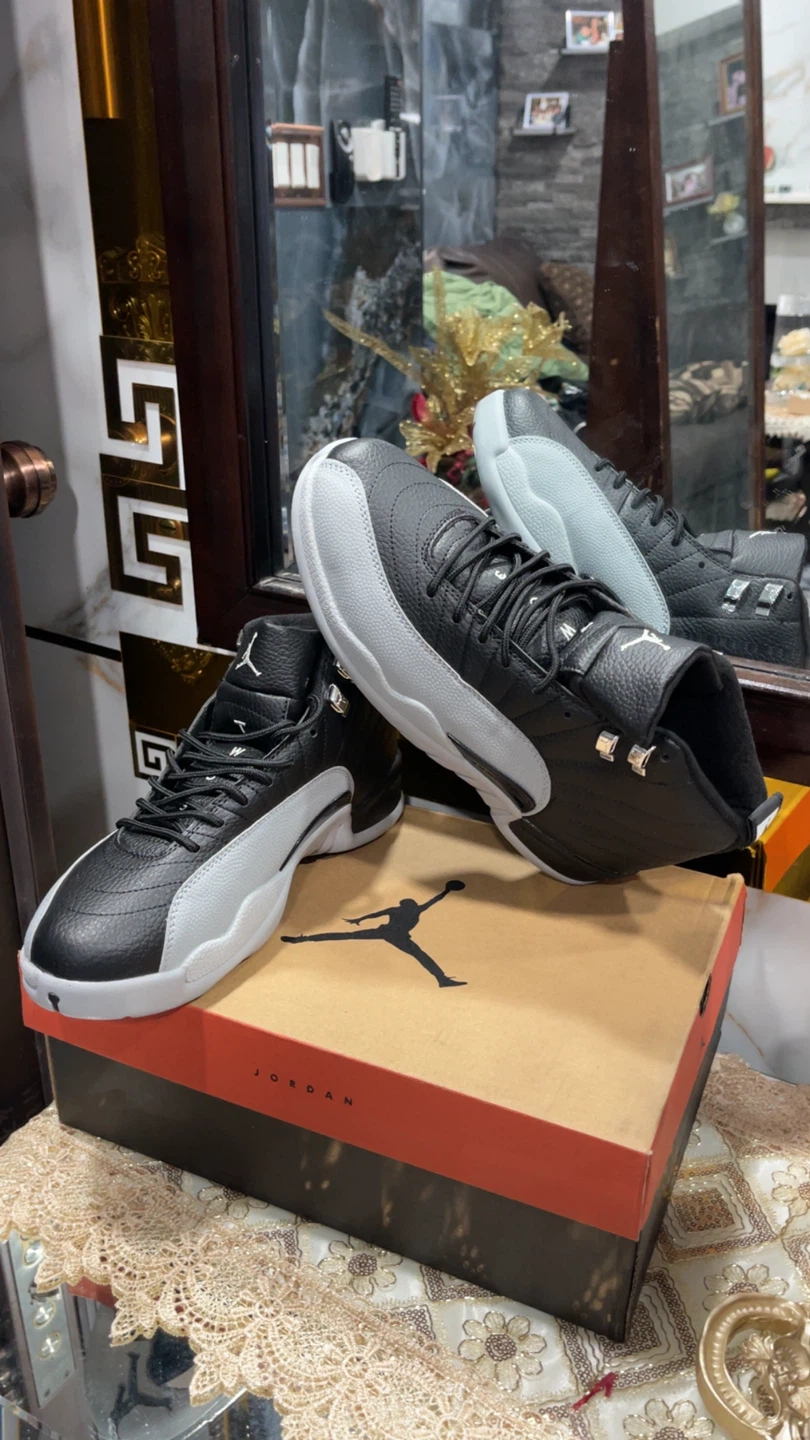 Classic black and grey Air Jordan 12 "Playoffs" sneakers. Features a leather and synthetic upper with iconic Jumpman branding. Includes original box.