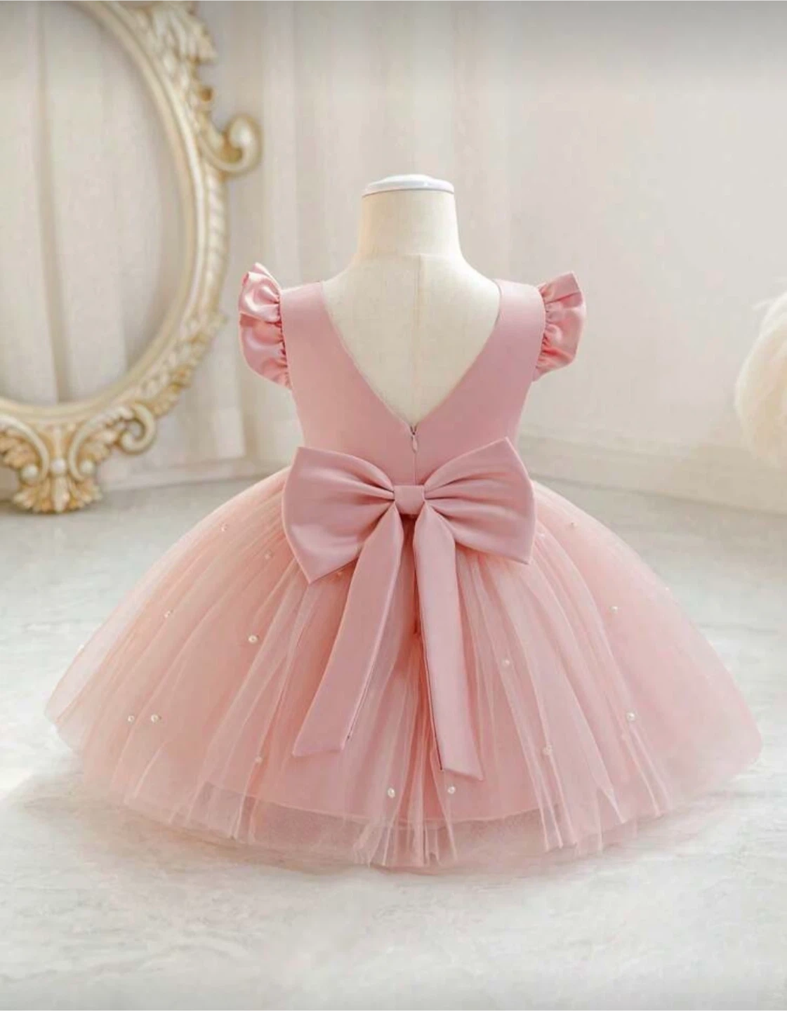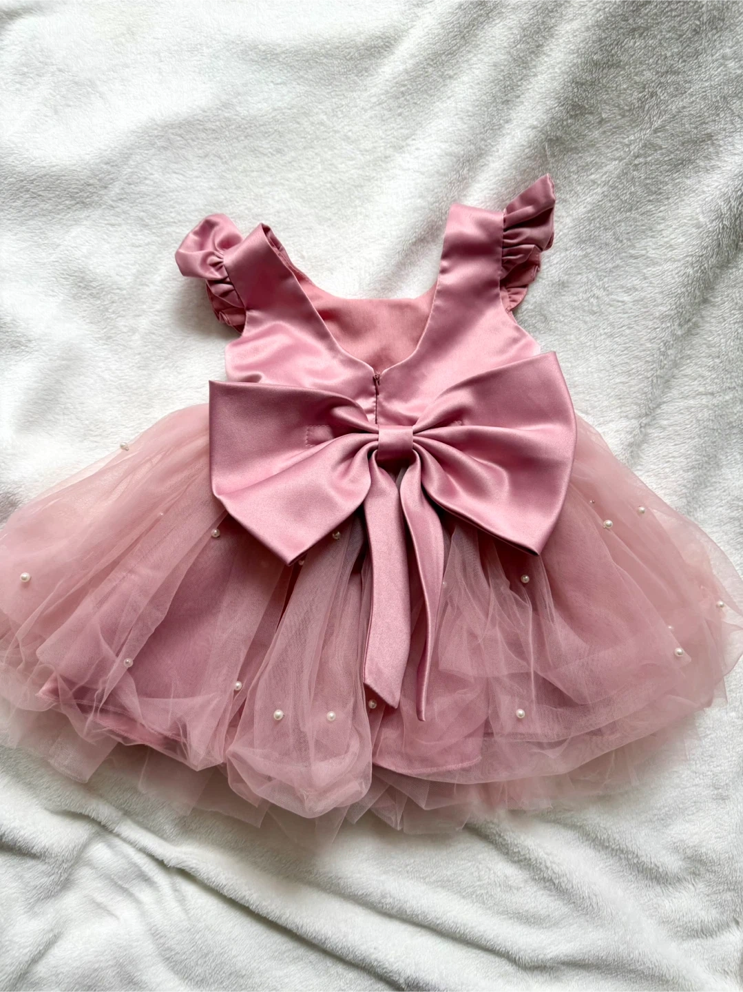 Adorable pink tulle dress, perfect for a flower girl or special occasion! This was only used ONCE for a photoshoot and size is 18 months. The dress features a satin bodice and a full, layered tulle skirt with delicate pearl accents. The back has a beautiful bow detail. It's in excellent condition and ready for its next event!