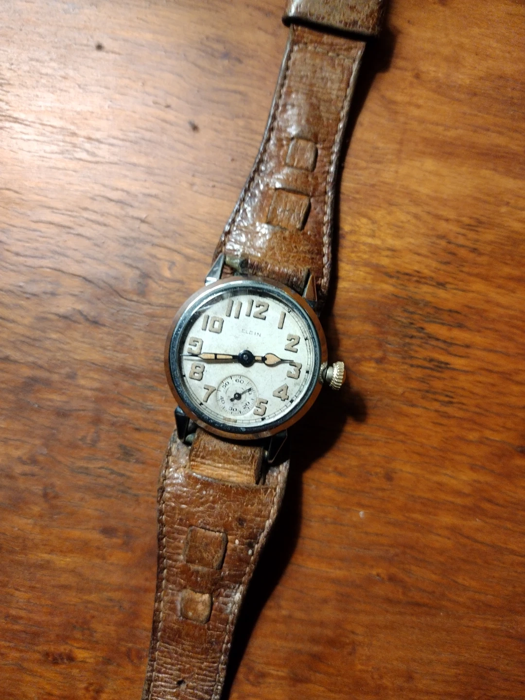 This is an antique Elgin wristwatch with a white dial and a small seconds subdial. It features a brown leather strap. It's a classic timepiece with a manual wind movement.