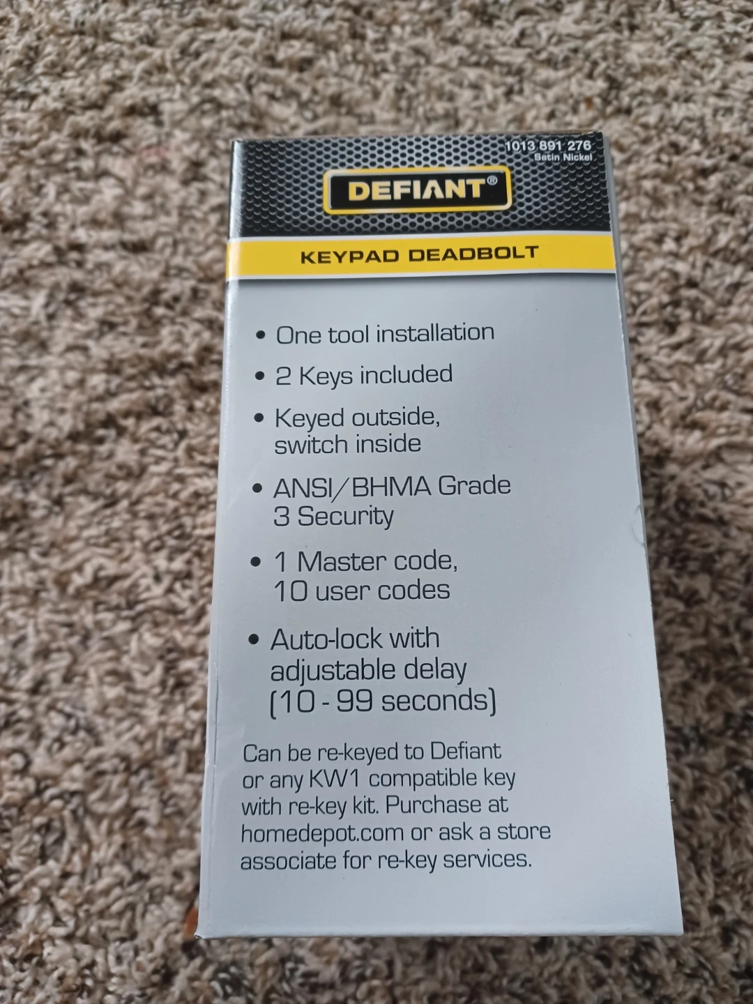 This is a Defiant keypad deadbolt in satin nickel. It features one-tool installation and comes with 2 keys. It supports auto-lock with an adjustable delay and up to 10 user codes. ANSI/BHMA Grade 3 security.