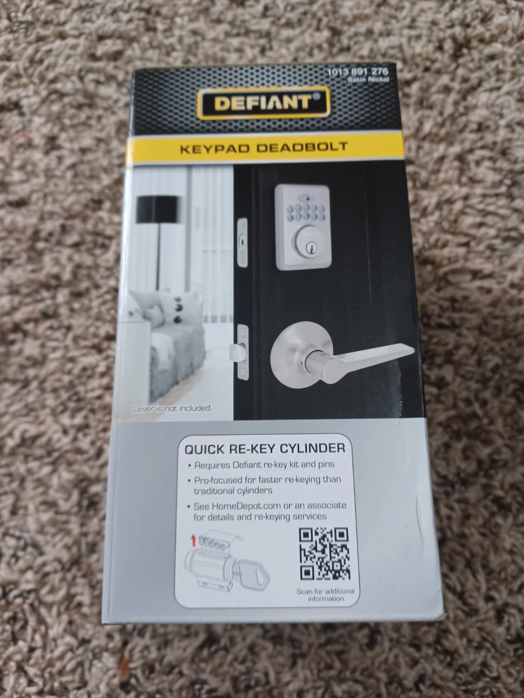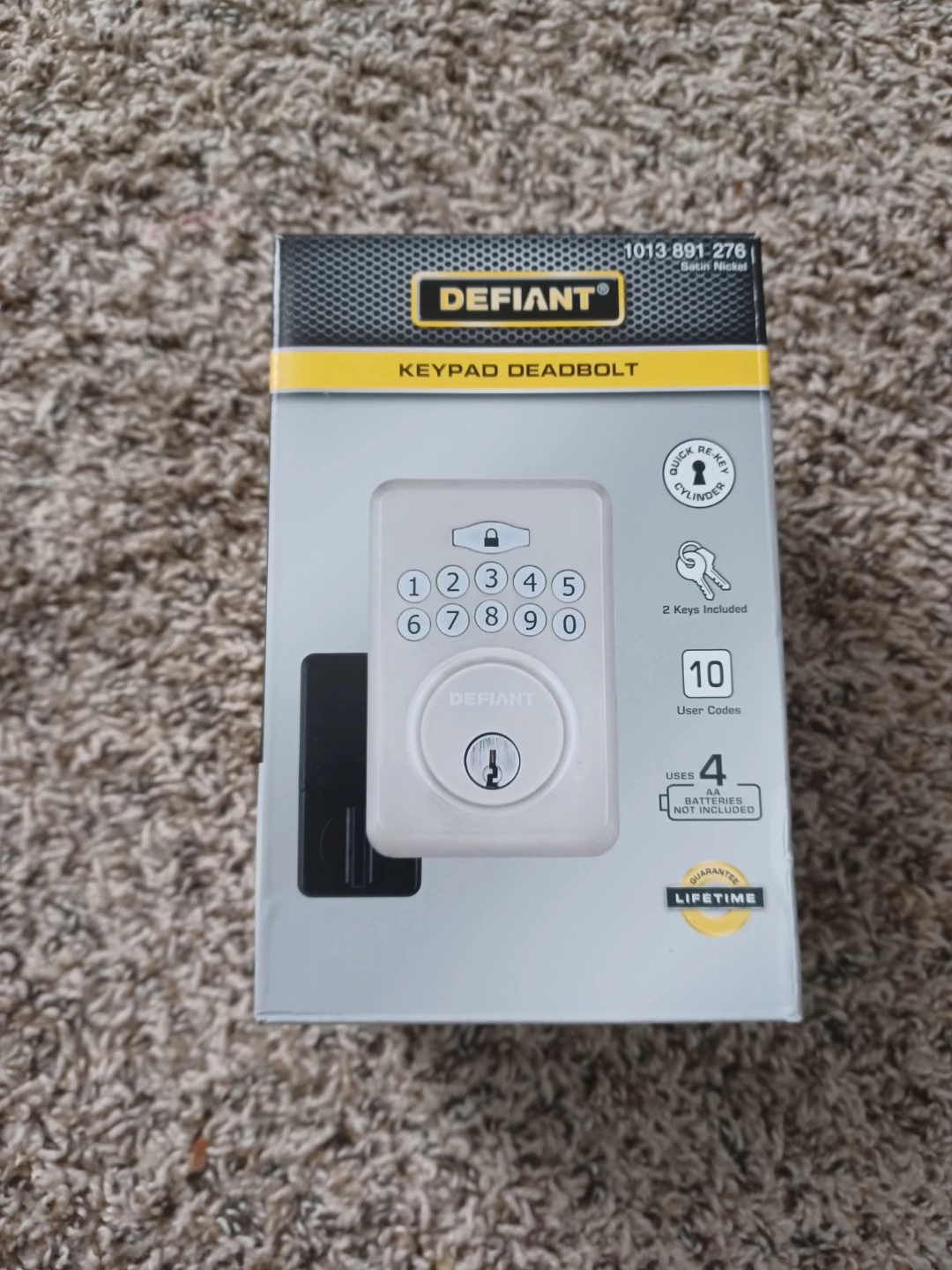 This is a Defiant keypad deadbolt in satin nickel. It features one-tool installation and comes with 2 keys. It supports auto-lock with an adjustable delay and up to 10 user codes. ANSI/BHMA Grade 3 security.