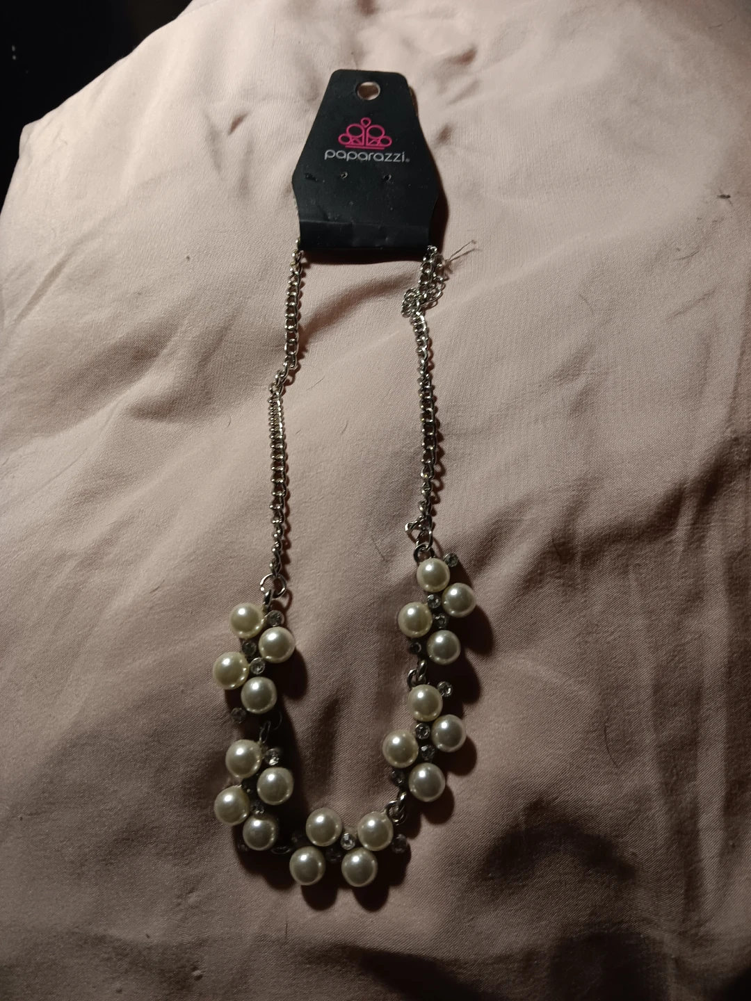 This Paparazzi necklace features a silver-tone chain with clusters of faux pearls and clear rhinestones. It's a lovely statement piece for any occasion!