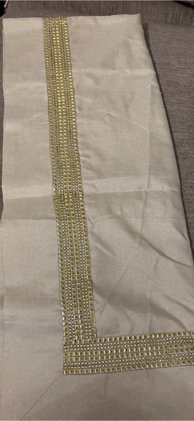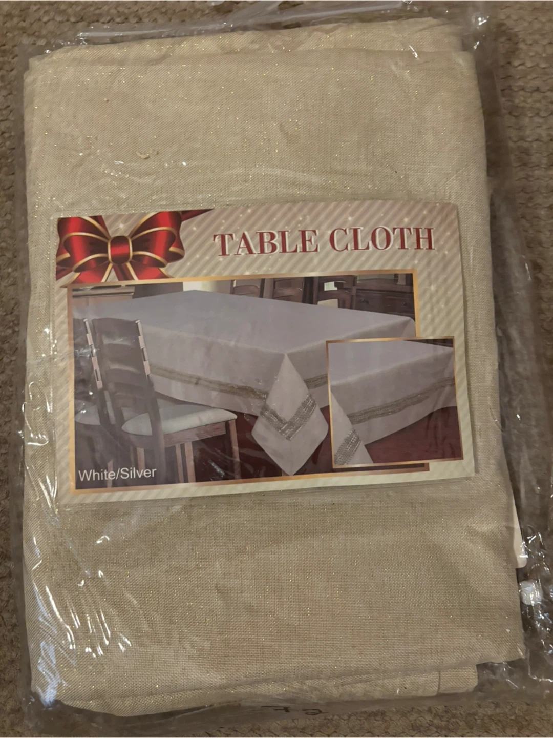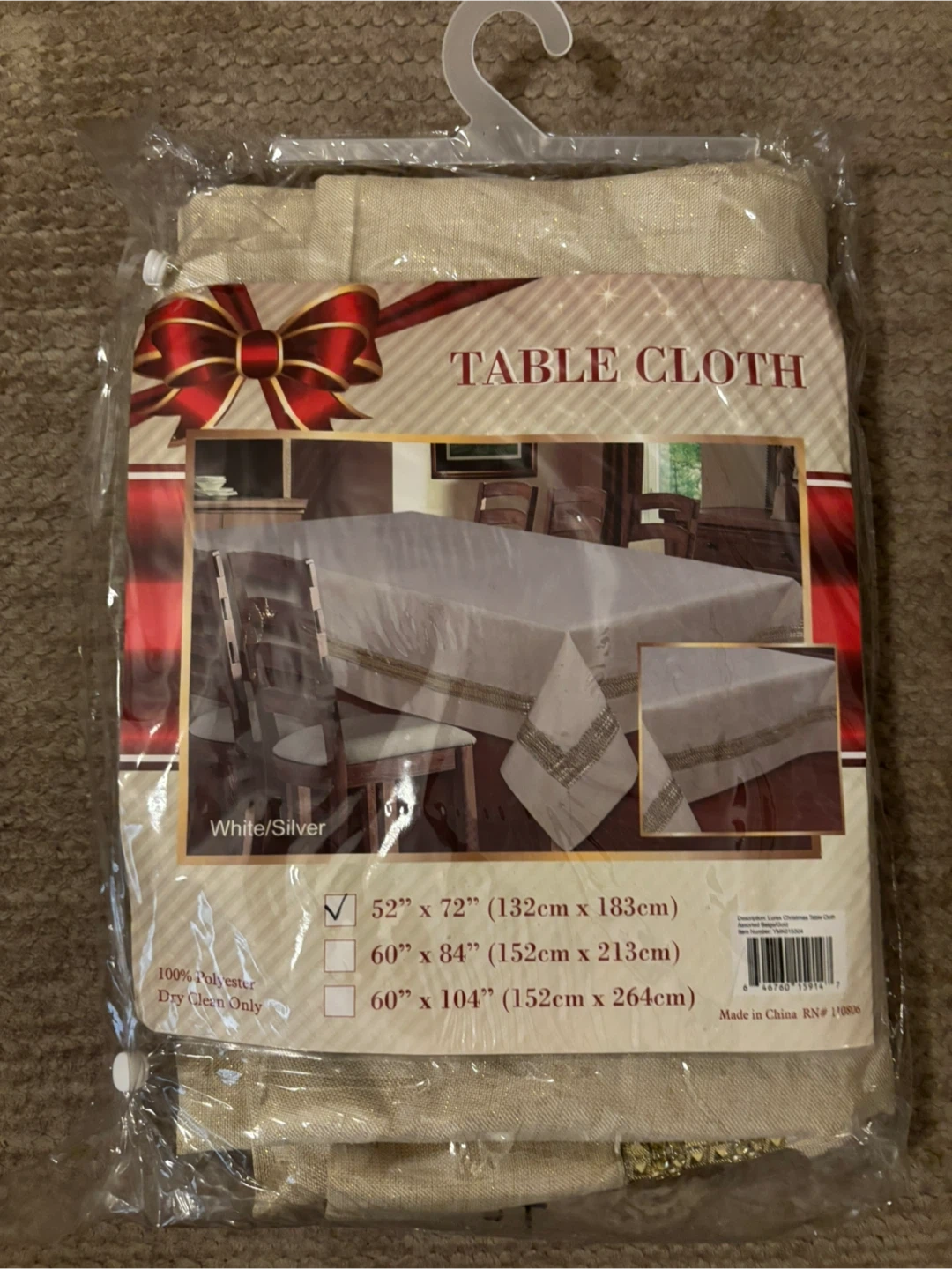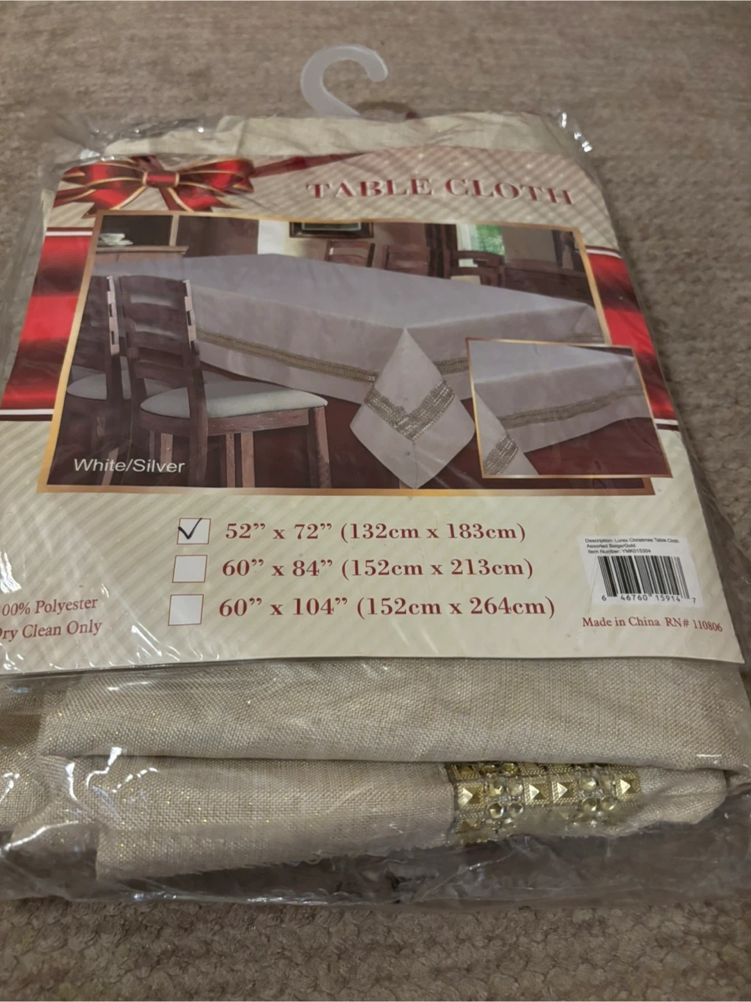 Selling a Beige/ Gold table cloth still in its original packaging! It's 52" x 72" (132cm x 183cm) and made of 100% polyester. Rectangle table.
