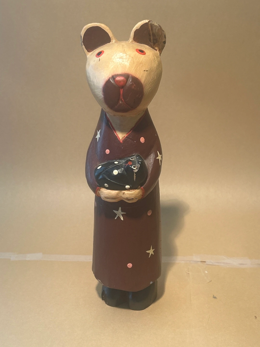 Adorable hand-painted wooden bear figurine. Brown dress with stars. Holding a small dark object. Unique collectible.