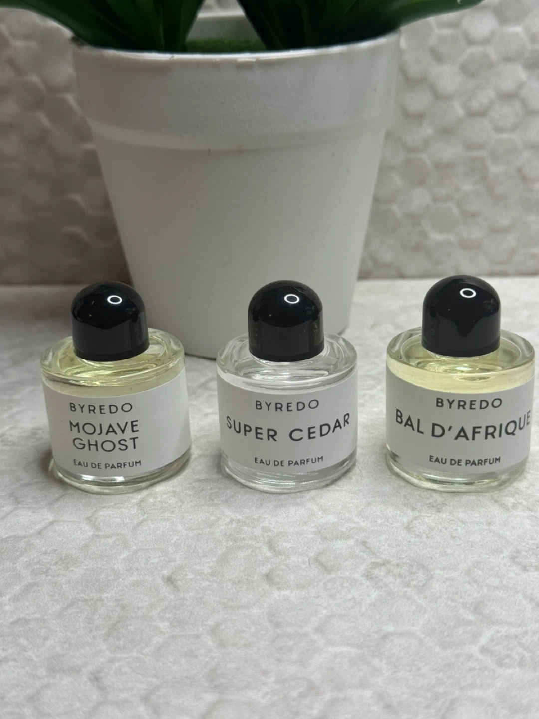 Selling a set of Byredo miniature perfumes! This set includes Mojave Ghost, Super Cedar, and Bal D'Afrique. Each bottle contains 10ml / 0.3 fl oz of Eau de Parfum. Comes with the original boxes