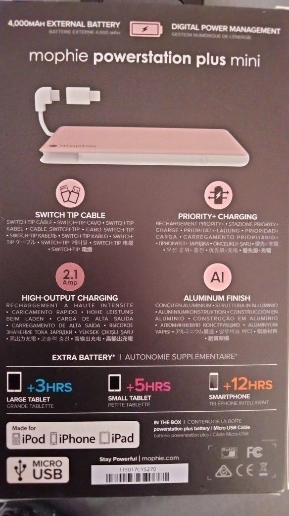 High output charging with aluminum finish. Provides approximately 3 hours of charge for large tablets, 5 hours for small tablets, and 12 hours for smartphones. Made for iPod, iPhone, and iPad. Includes Micro USB cable.