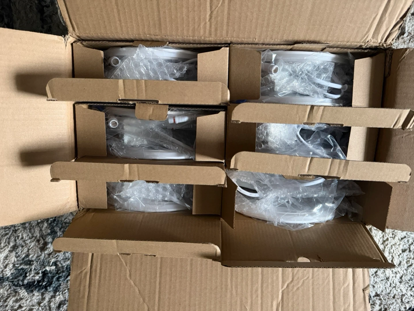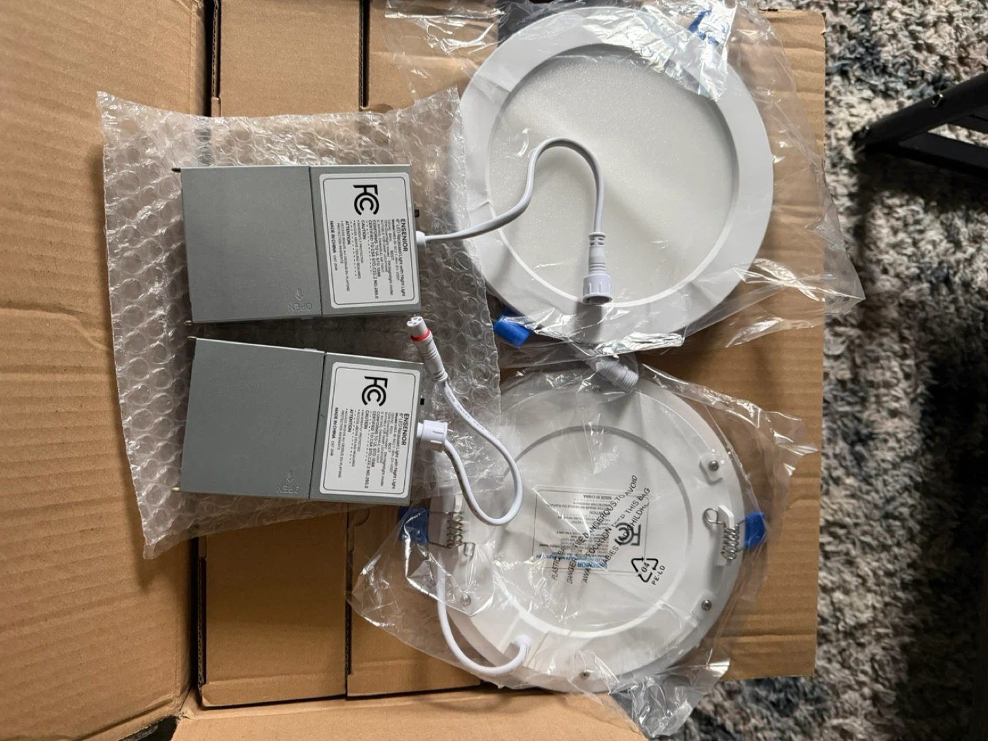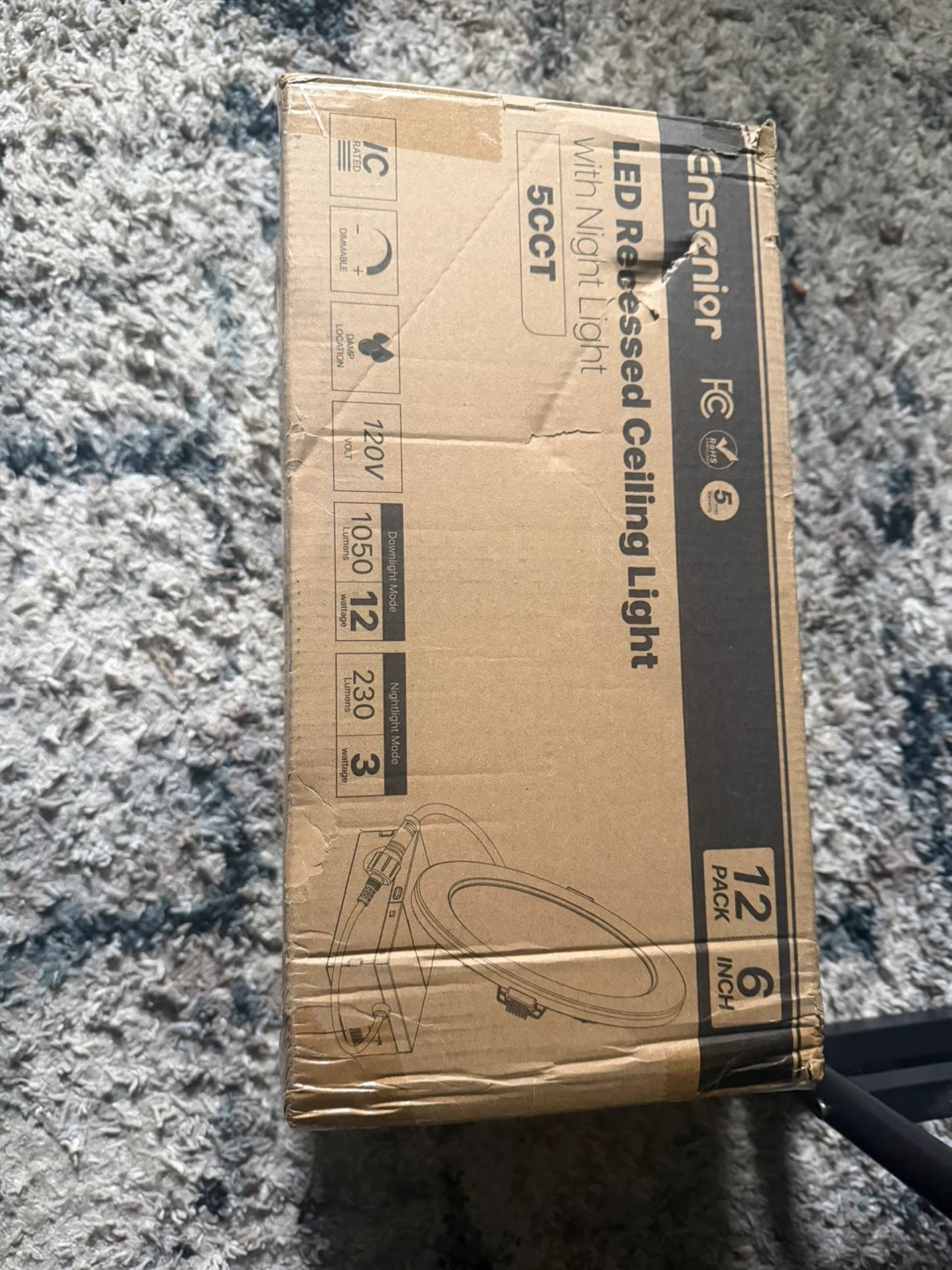 These are 12-packs of 6-inch LED recessed ceiling lights from Ensenior. They feature a night light mode and are dimmable. Each light is 120V and consumes 12 watts.