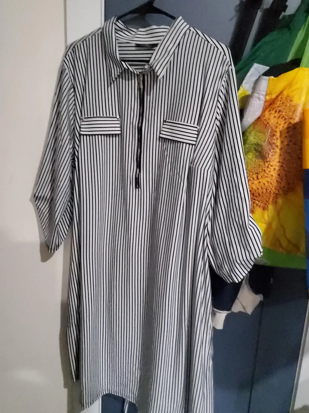 This is a black and white striped shirt with a zip-up front. It has a collared neckline and two chest pockets. It's a tunic-style shirt with elbow-length sleeves.