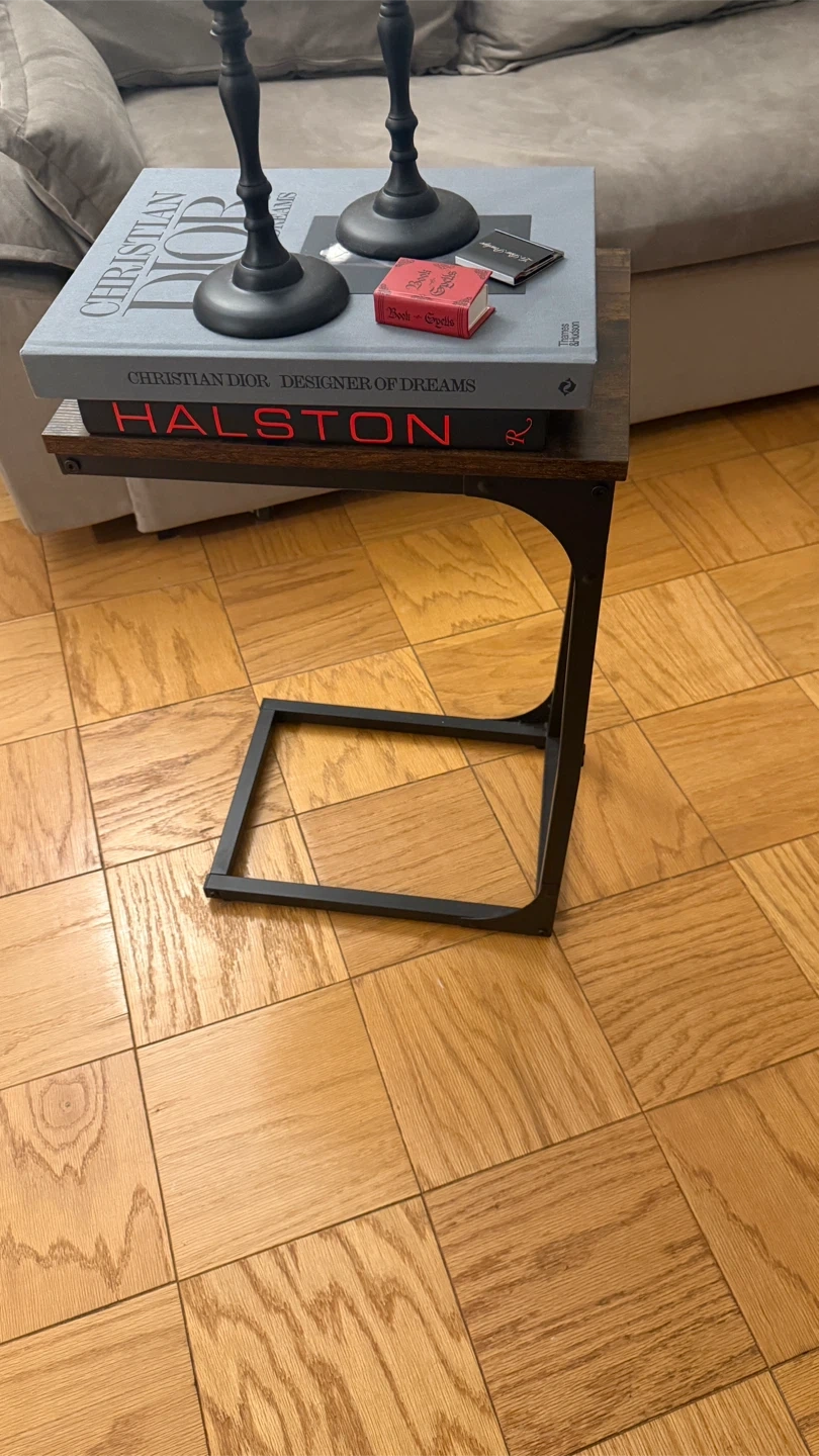 60This is a stylish C-shaped side table with a dark wood-look top and a black metal frame. It's in great condition and would be perfect for holding drinks, books, or other items next to your couch or bed