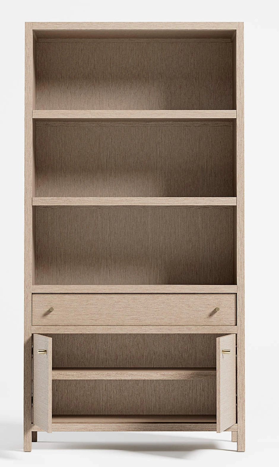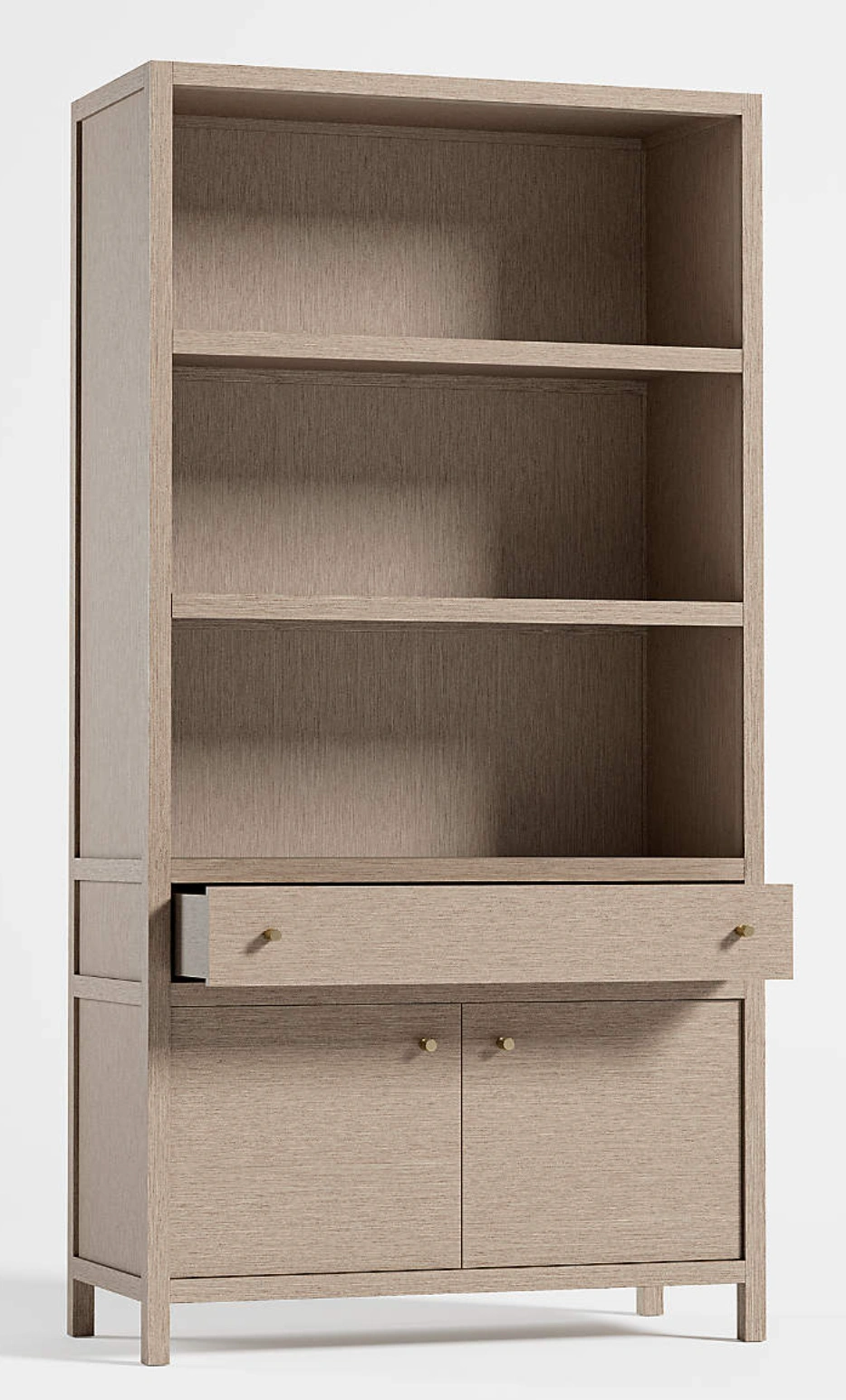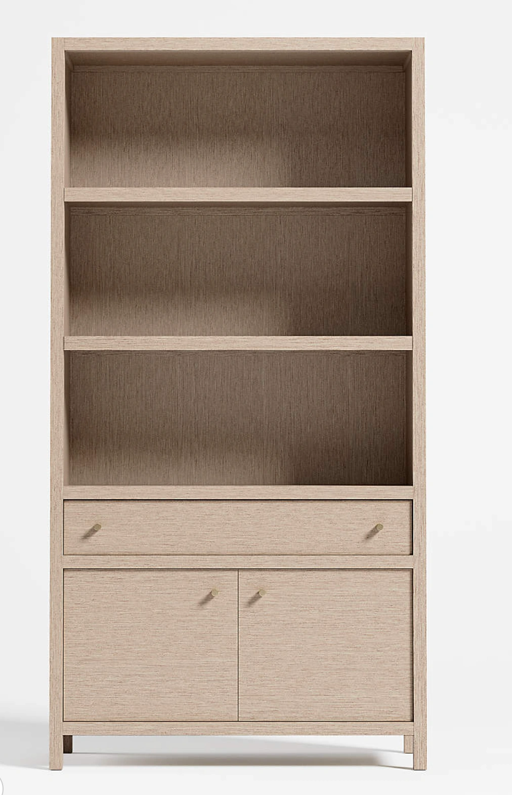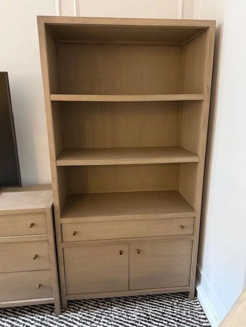 Crate & Barrel Keane 40” storage bookcase in Weathered Natural finish. Purchased new 6 months ago and in perfect, like-new condition — not a mark on it. From a clean, well-kept home. Smoke-free.
