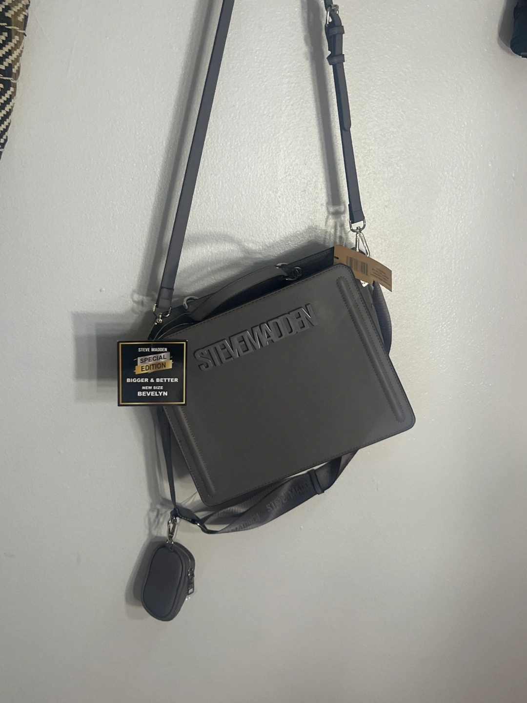 The Steve Madden Bevlyn satchel bag is a stylish and versatile accessory! It features the Steve Madden logo prominently displayed. This bag is perfect for carrying your essentials in style