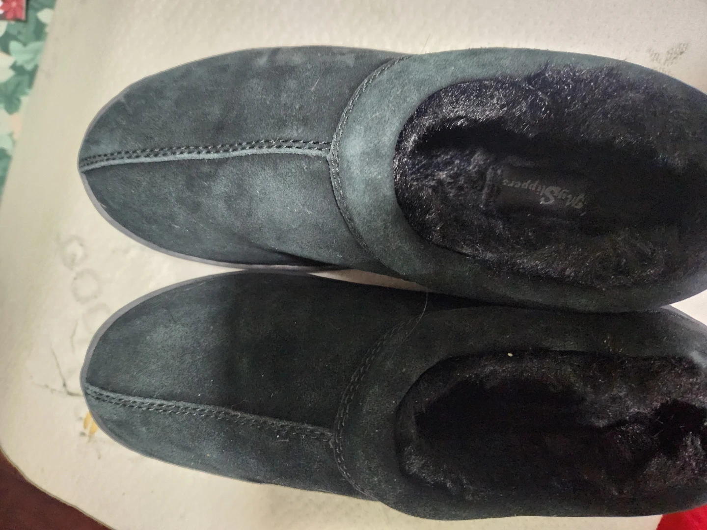 Selling a pair of black My Slippers slippers in size 10. They're in good condition and super comfy for lounging around the house