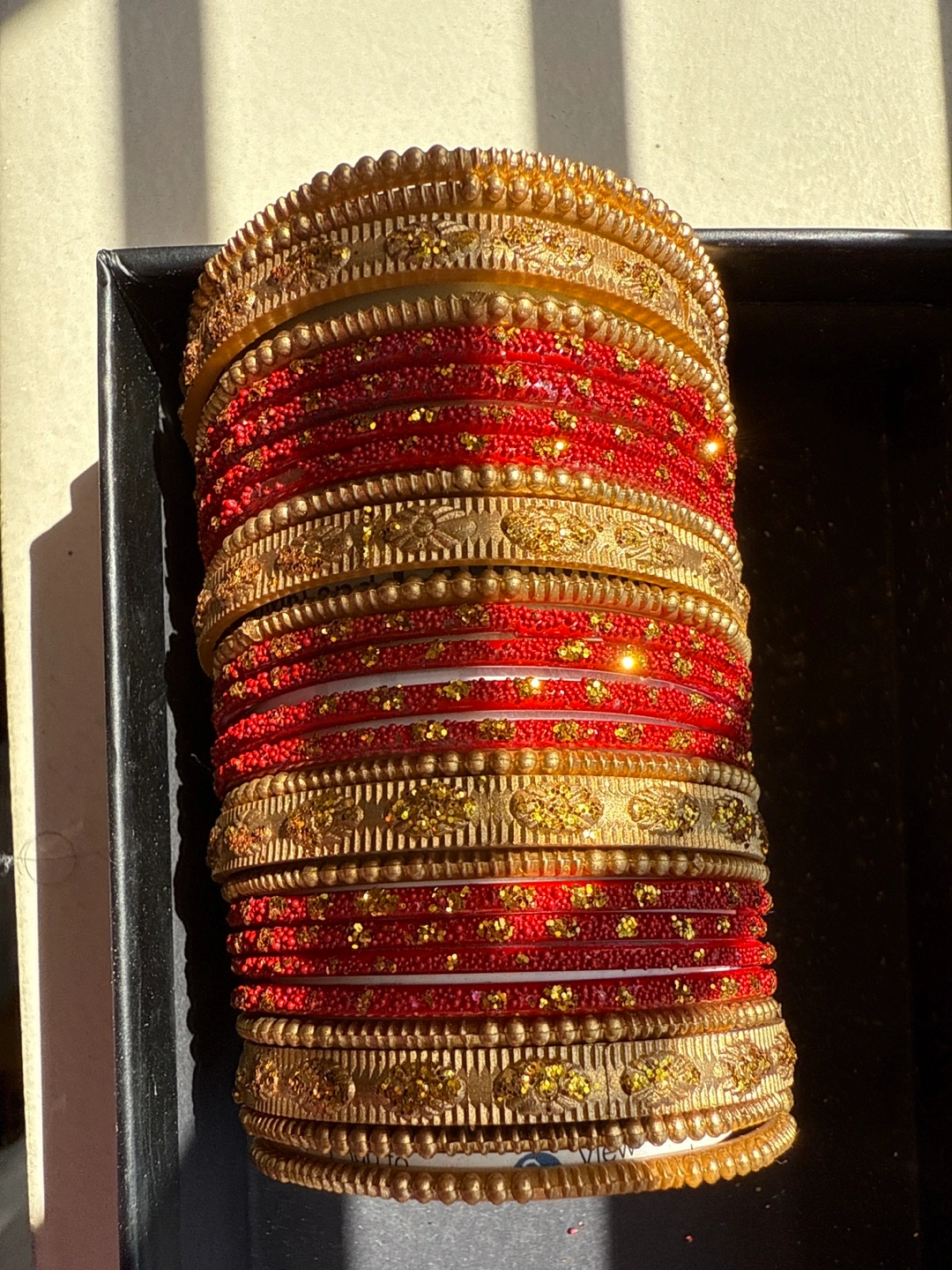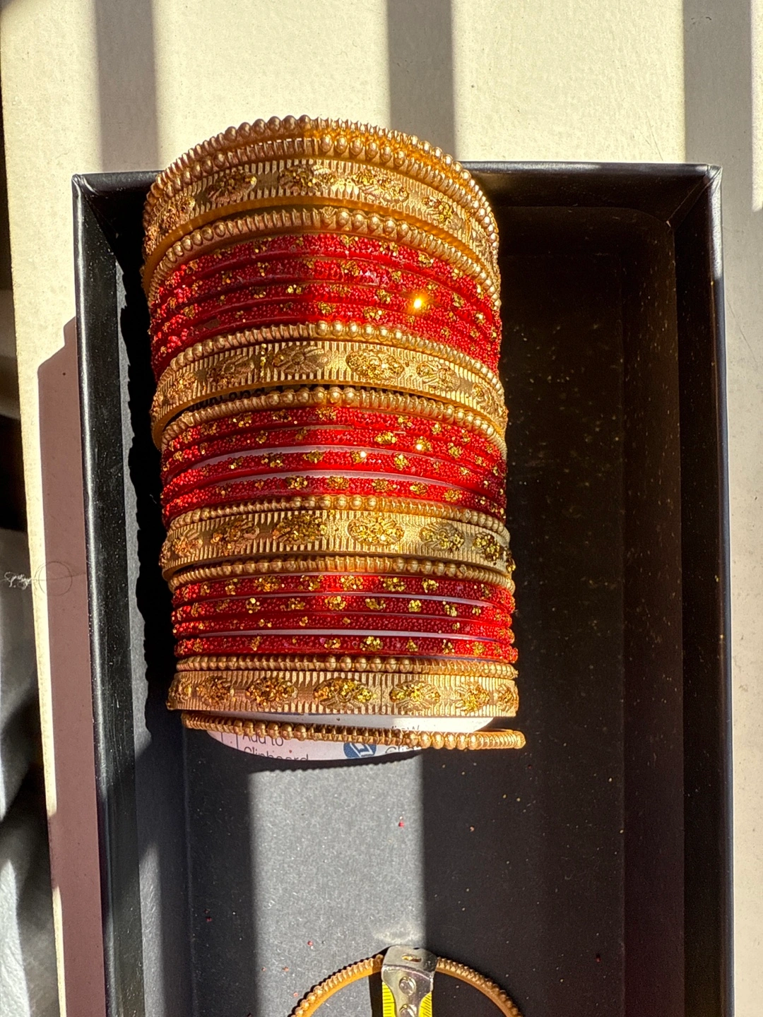 Selling a beautiful set of Indian bangles in red and gold. There are over 26 bangles in the set. The size of the bangles is approximately 2.5 inches in diameter. They are in great condition and ready to add a touch of elegance to any outfit!