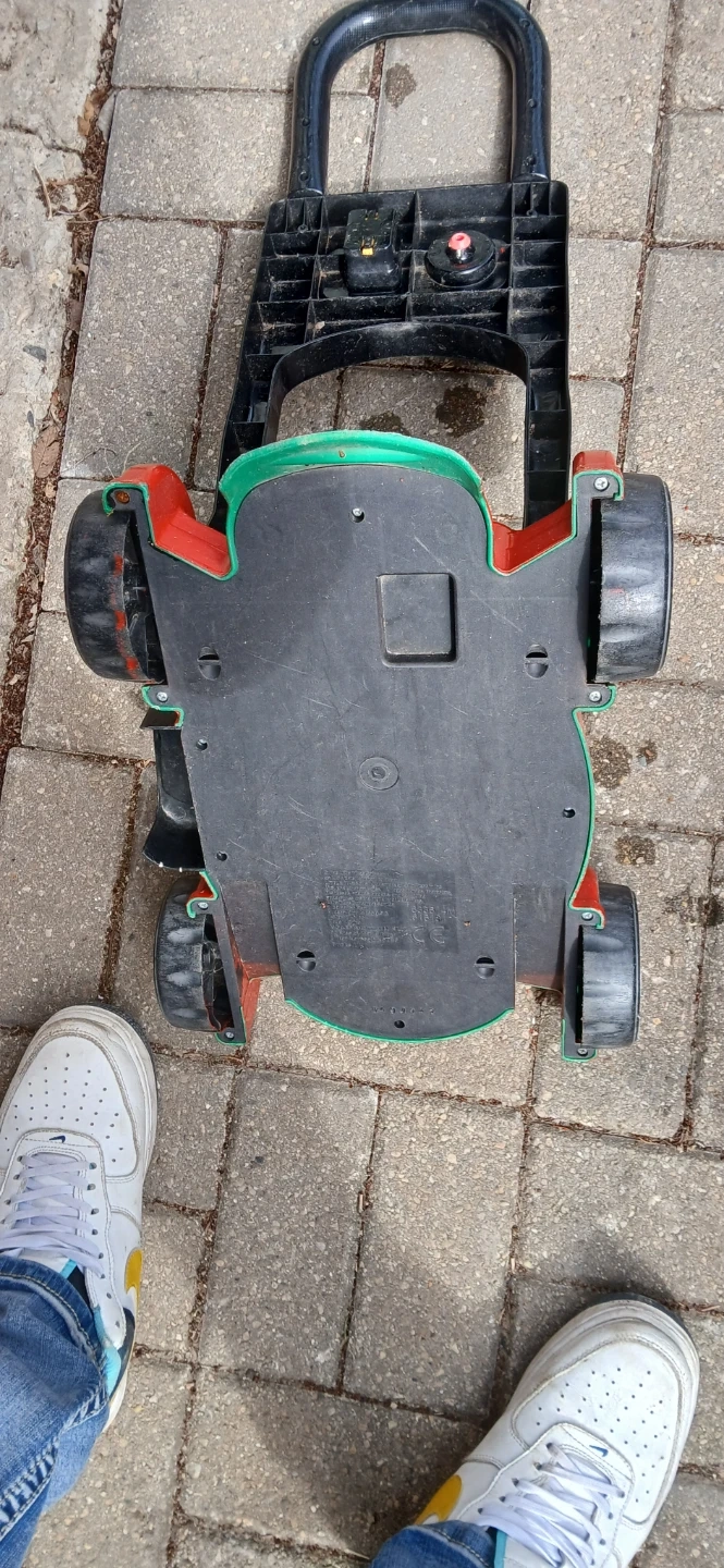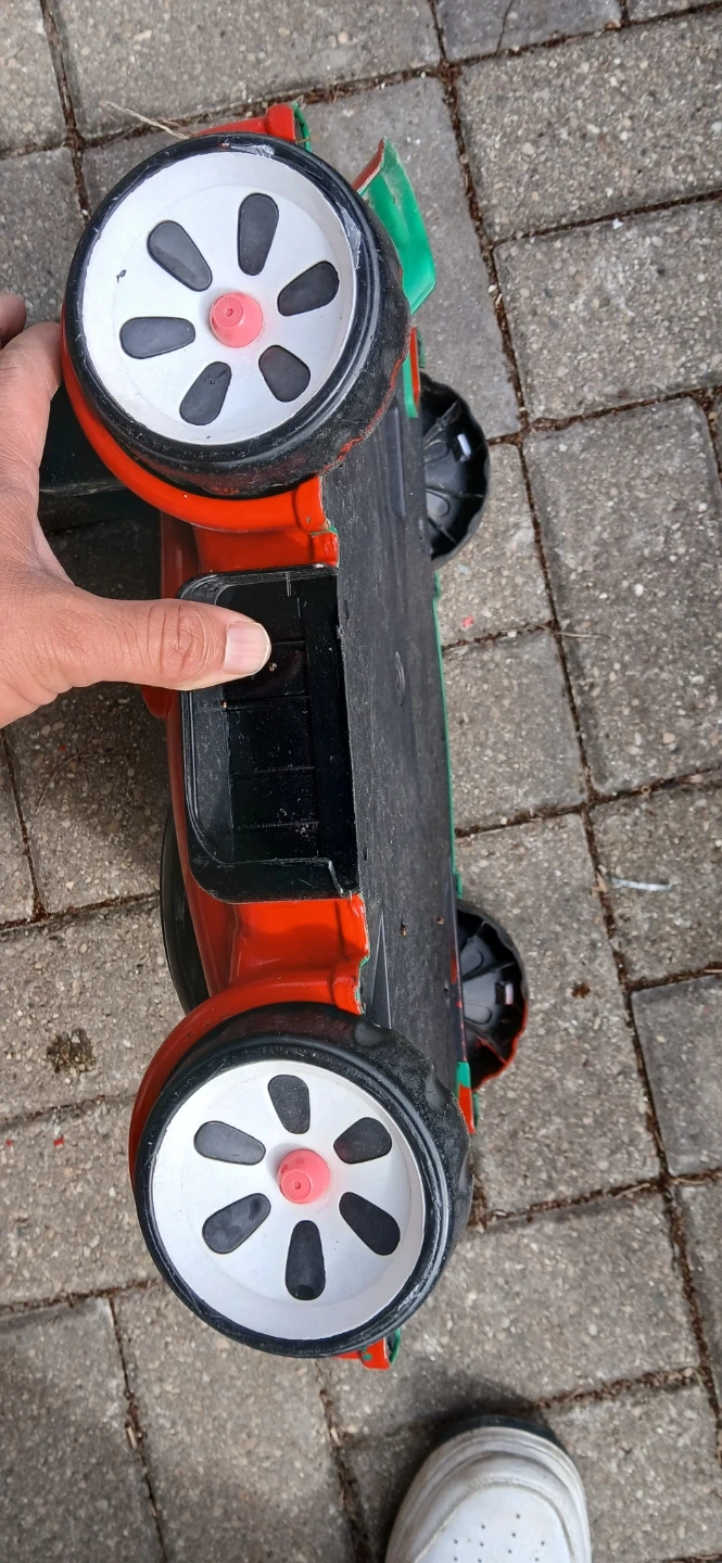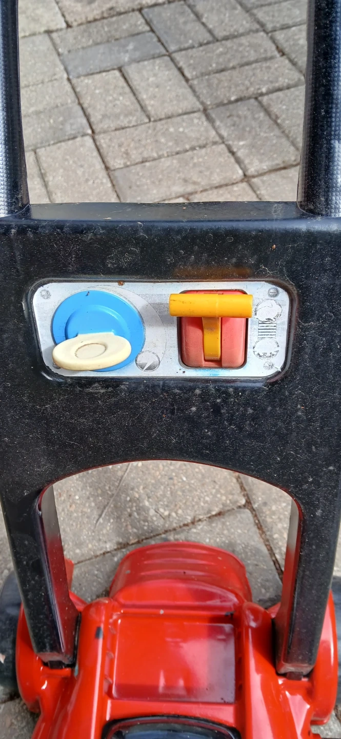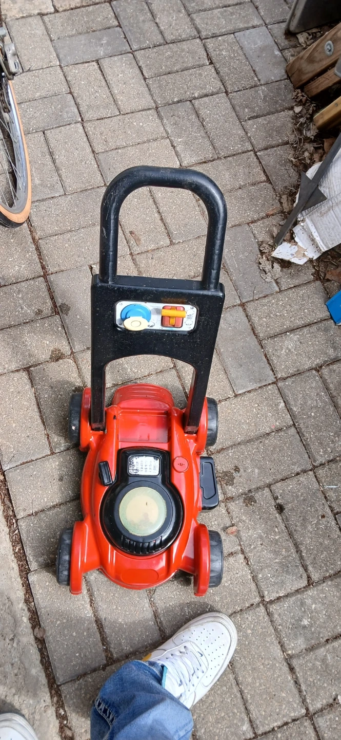 This is a red and green Little Tikes push mower toy. It features a handle for pushing and colorful buttons on the front. It's a fun toy for outdoor play!