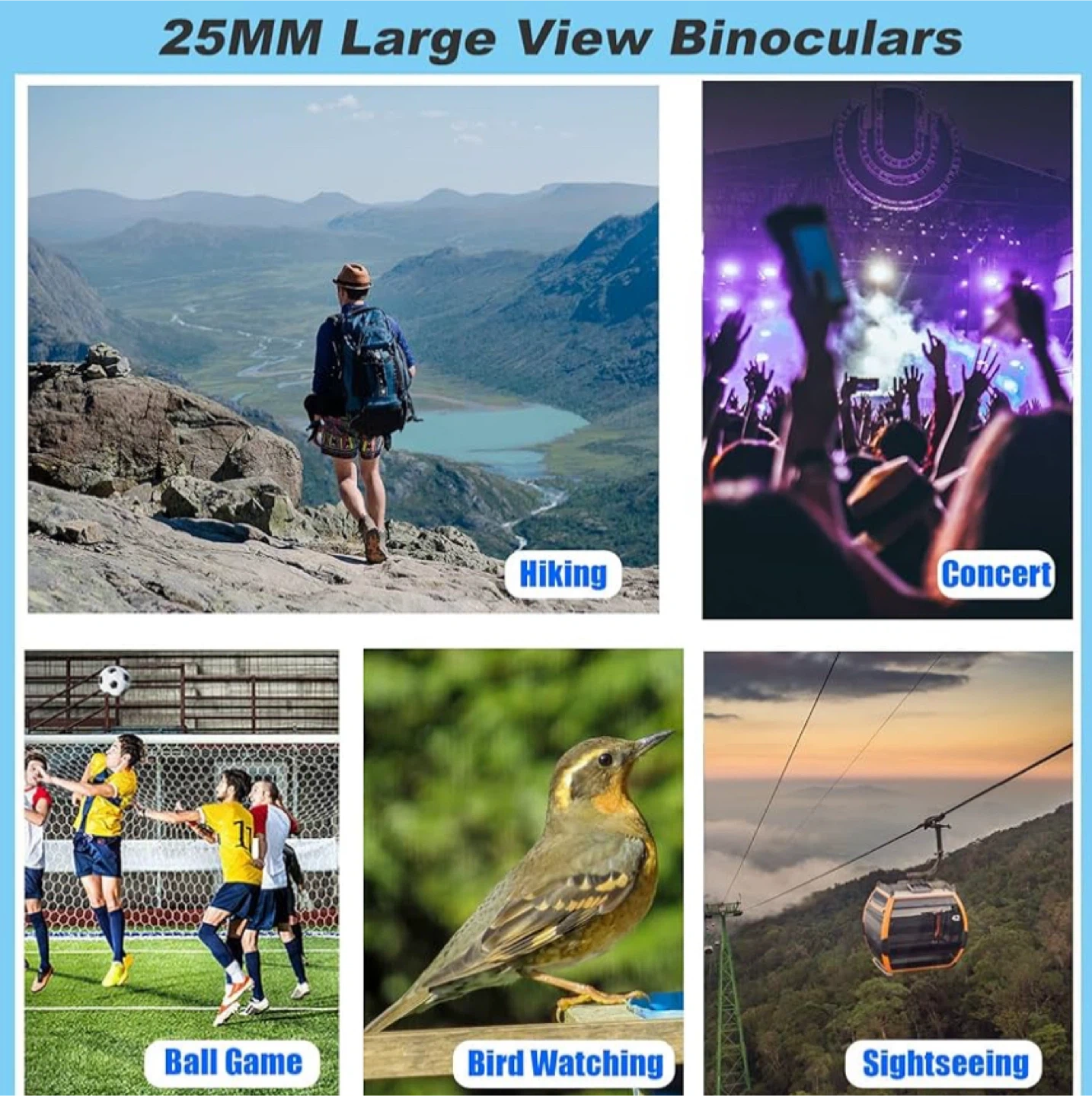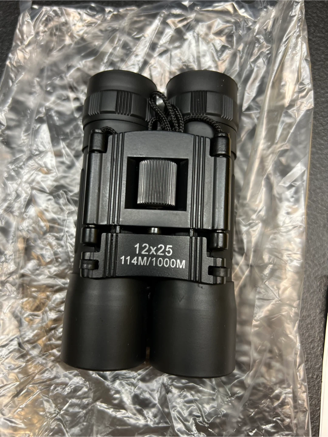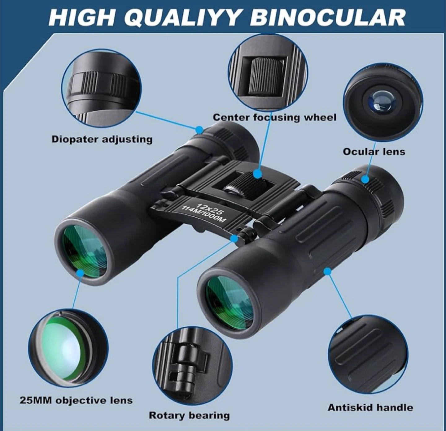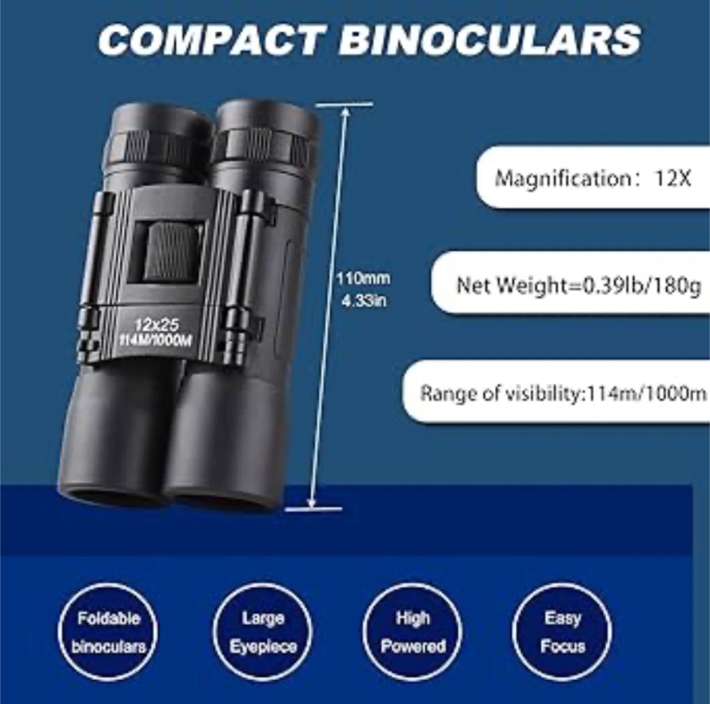 These mini compact binoculars are NEW and ready for your next adventure! They feature 12x magnification and a 25mm eyepiece for a large and bright view.