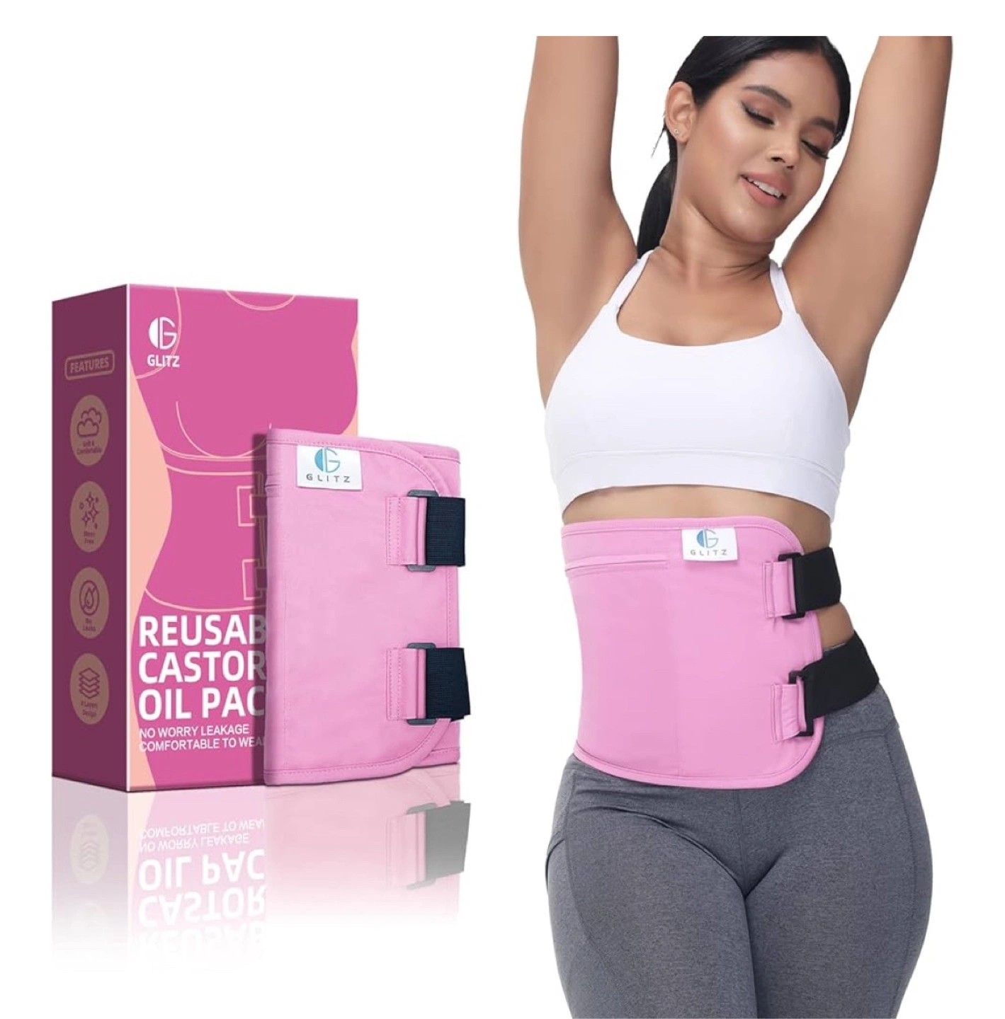Pink castor oil pack. Four layers, leakproof. Comfortable to wear. Promotes liver and kidney detox, relaxation, and improved sleep. Stimulates lymphatic system.