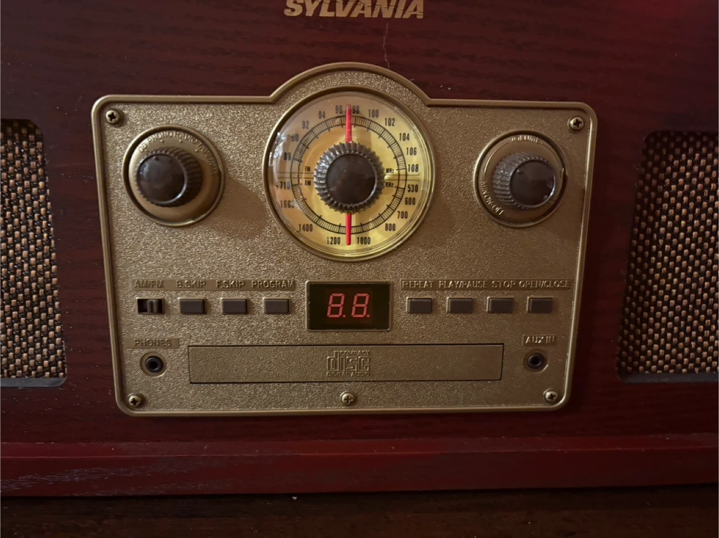 This Sylvania record player plays vinyl records, CDs, and AM/FM radio. It features a classic wood-grain finish and built-in speakers. It also has headphone and auxiliary inputs for versatile listening options!