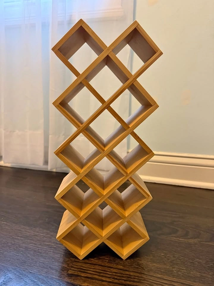 Criss cross design bamboo spice rack holds 18 standard spice jars. Countertop standing design — no installation required. Clean, sturdy, and in good condition. Excellent for organizing your kitchen. Jars not included. Pick up in Canaryville.