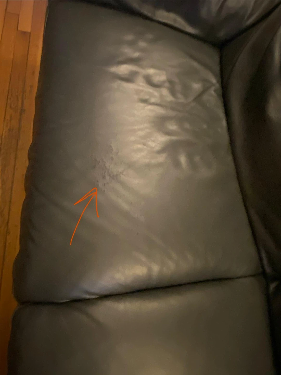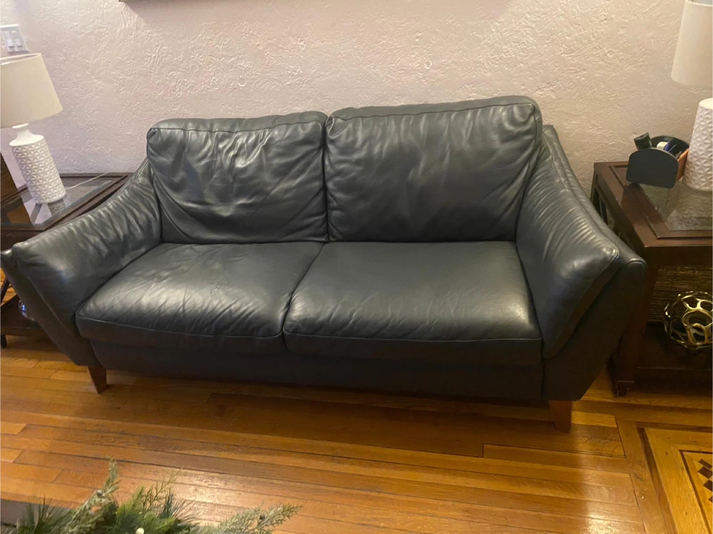Selling a comfortable black leather two-seat sofa. It's in good condition and perfect for a smaller space. There is a small stain on one of the cushions.