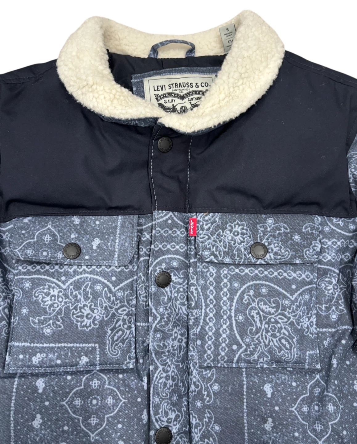 Levi Strauss & Co. puffer jacket with a unique bandana print! It's a size small and features a cozy sherpa collar. Great for staying warm and stylish during cooler weather