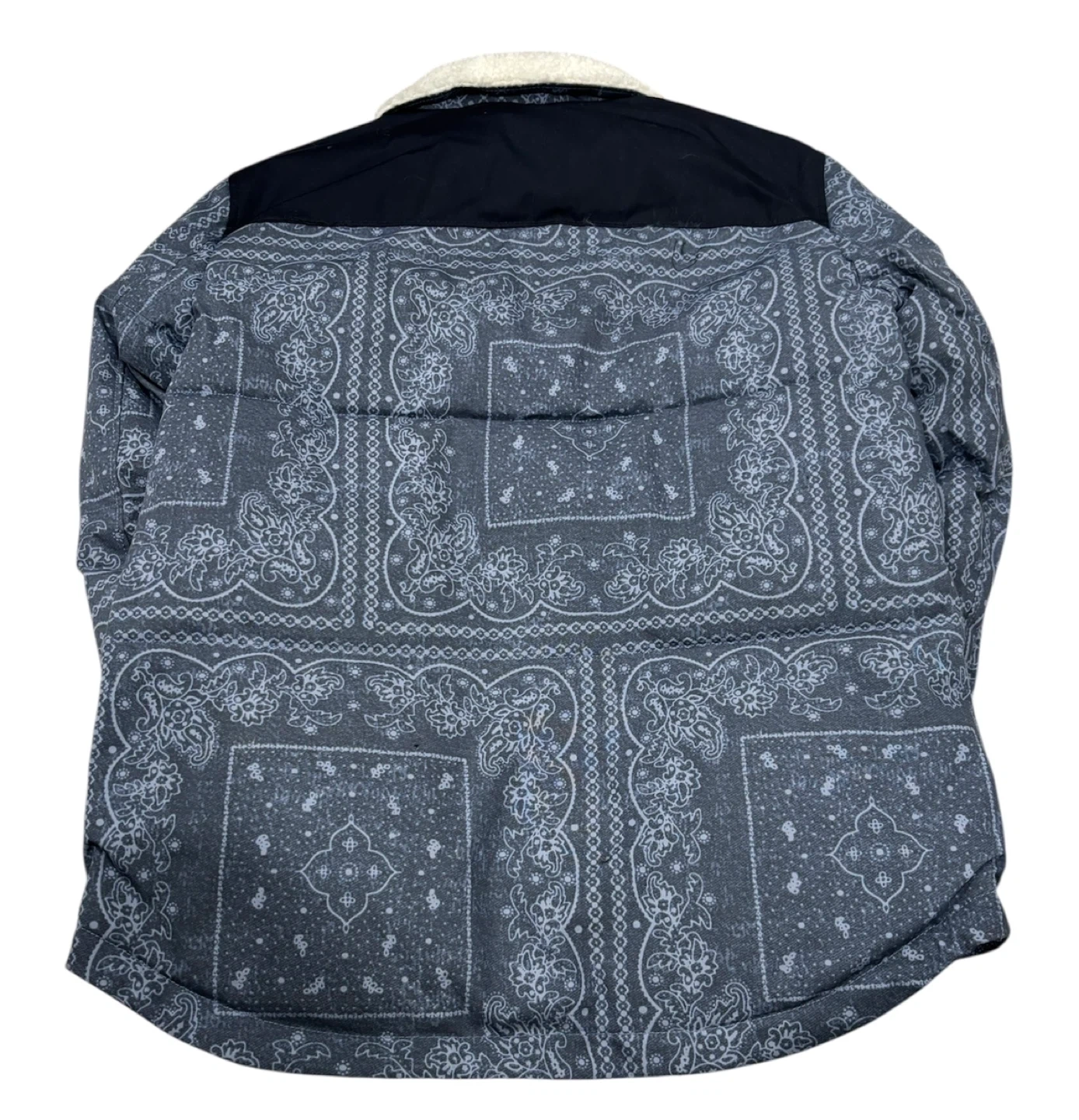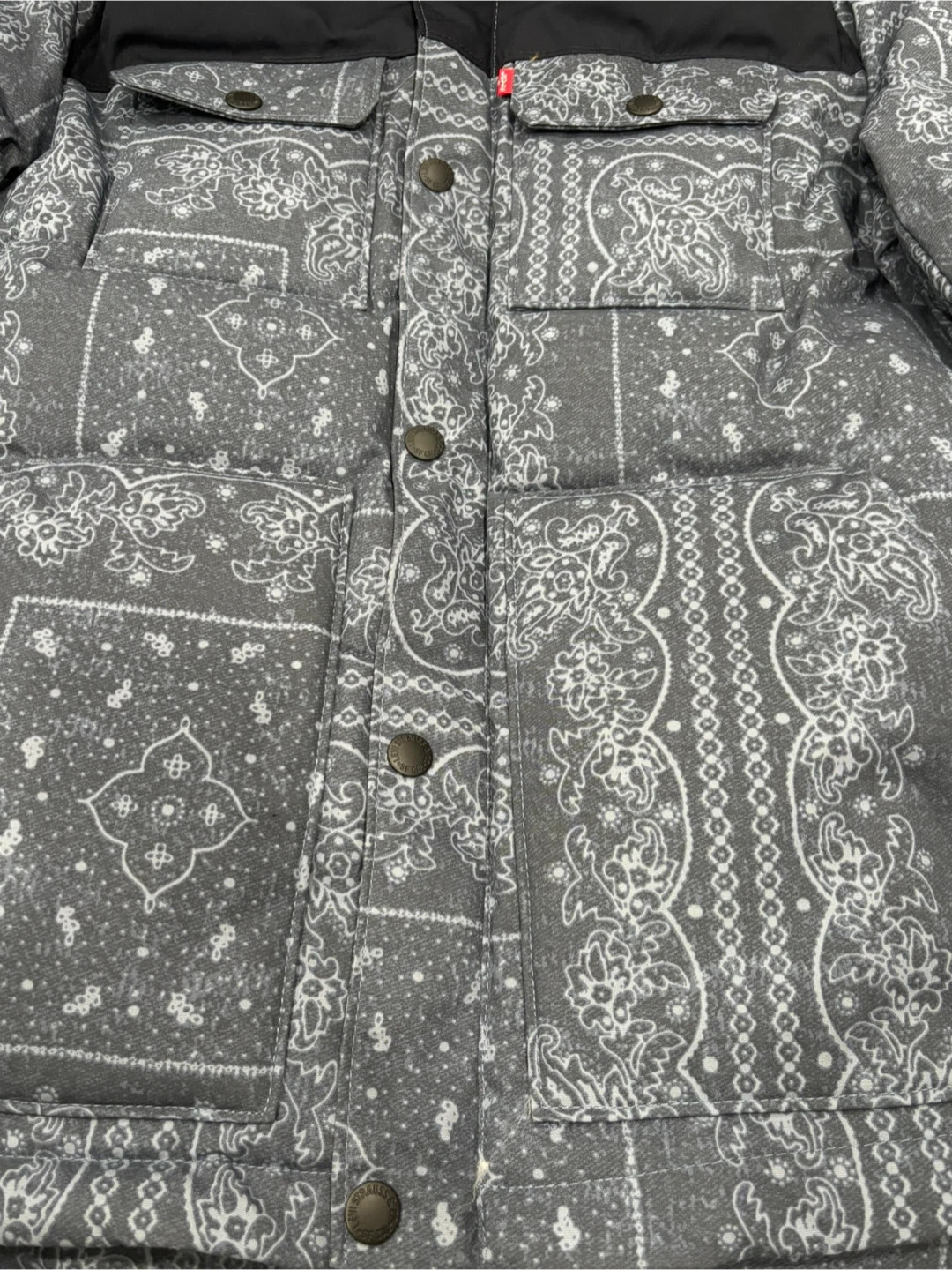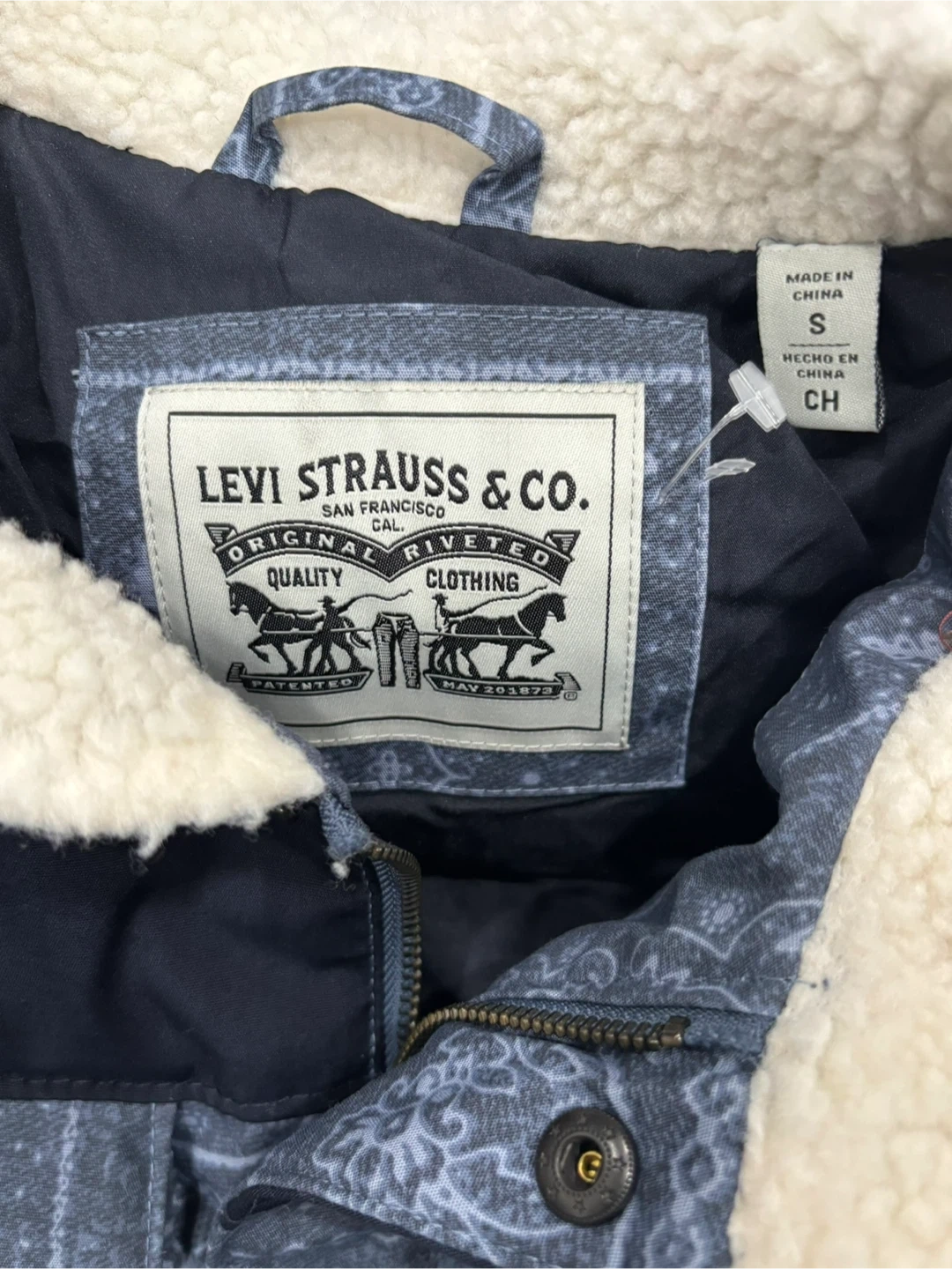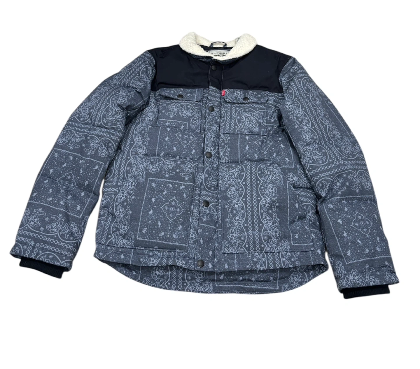 Levi Strauss & Co. puffer jacket with a unique bandana print! It's a size small and features a cozy sherpa collar. Great for staying warm and stylish during cooler weather