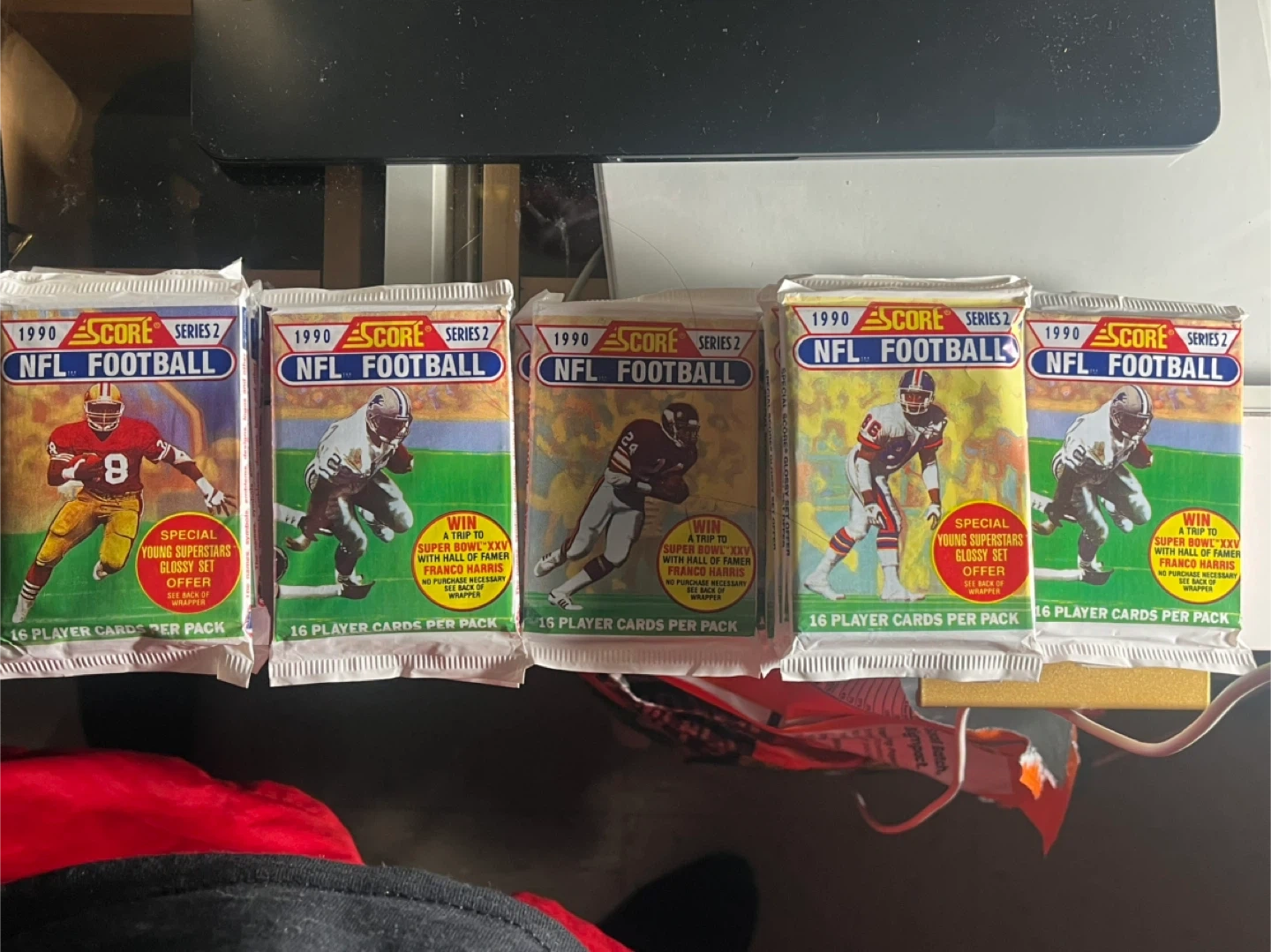 This listing includes five unopened packs of 1990 Score Series 2 NFL Football trading cards. Each pack contains 16 player cards. Some packs offer a chance to win a trip to Super Bowl XXV with Franco Harris and a special Young Superstars Glossy Set.
