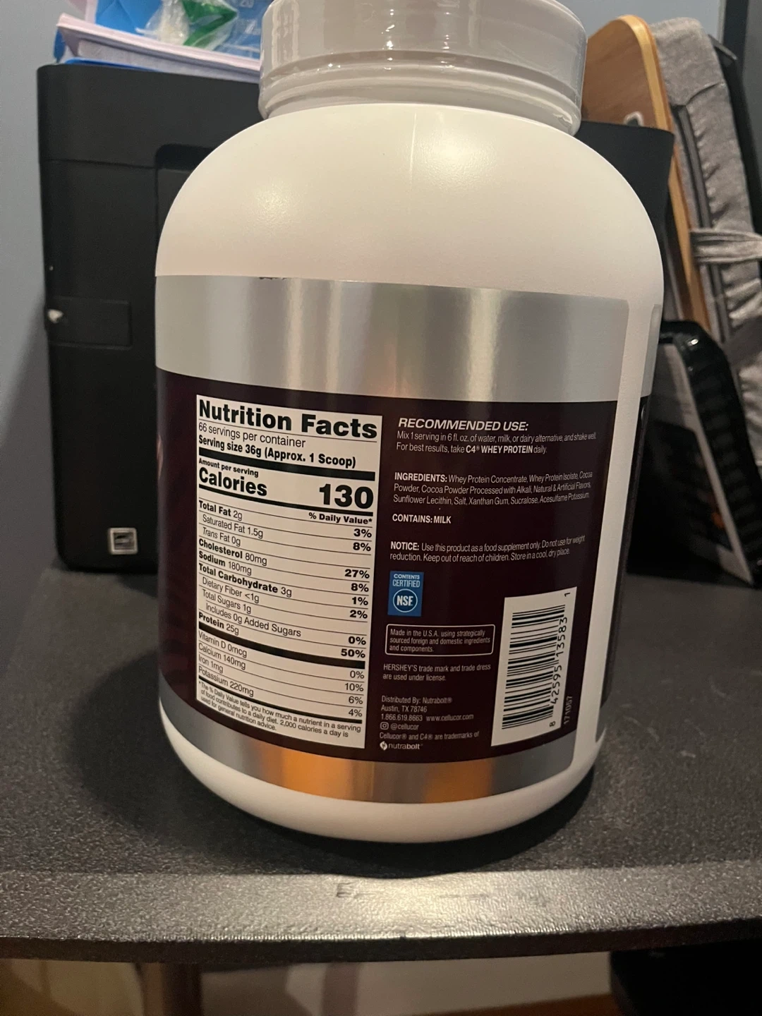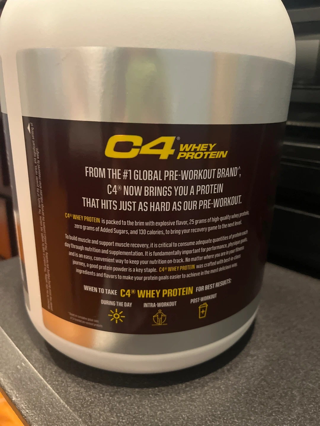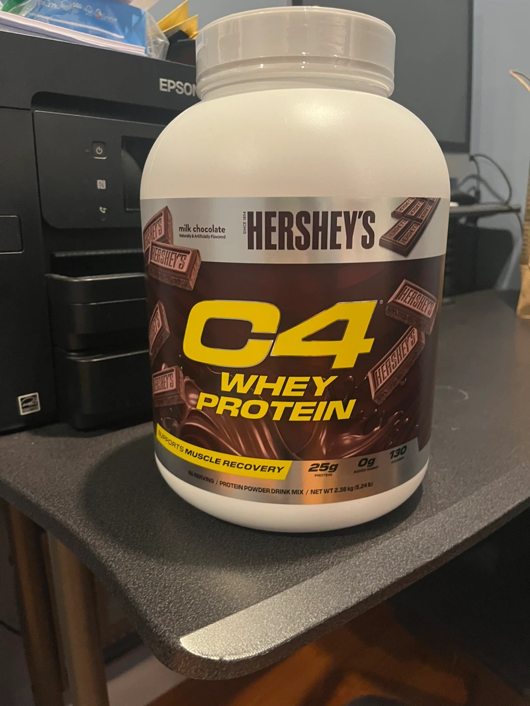 79Selling a C4 Whey Protein in Hershey's Milk Chocolate flavor! It's packed with 25 grams of high-quality whey protein and has zero grams of added sugars, with only 130 calories per serving. This protein powder mix is great for muscle recovery. It’s sealed and hasn’t been opened!