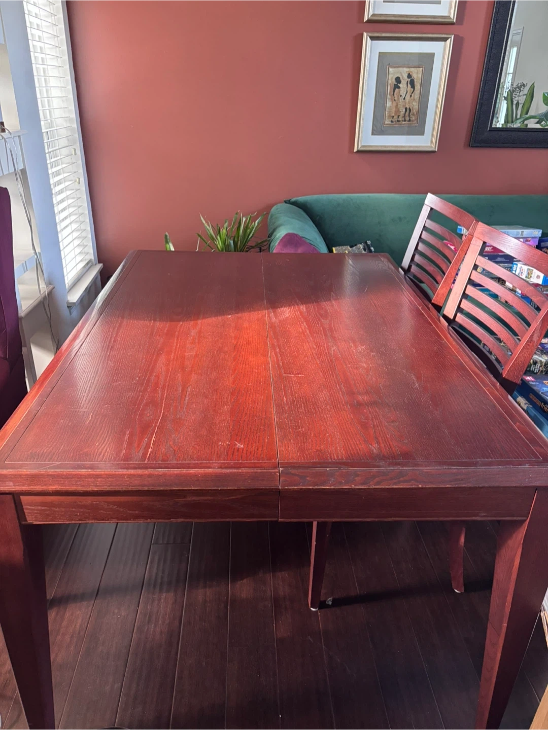 A sturdy wooden dining table with a rich, dark cherry finish. It's a great size for family meals or entertaining guests. This table seats six (or 8 with leaf) comfortably. It's a classic piece for any dining room! NO CHAIRS!