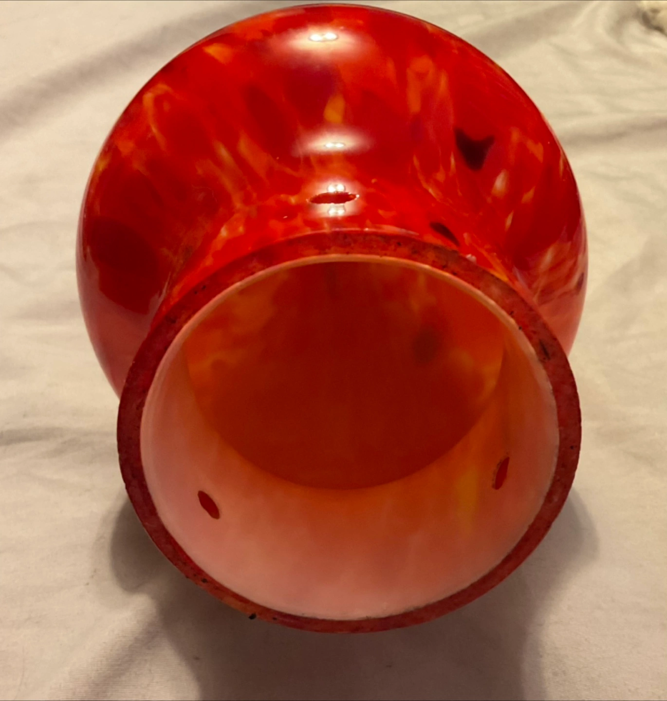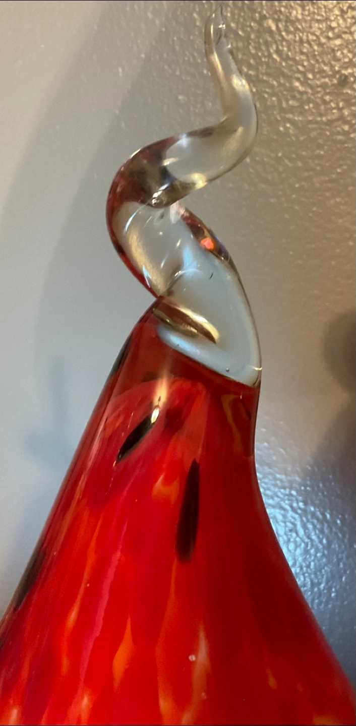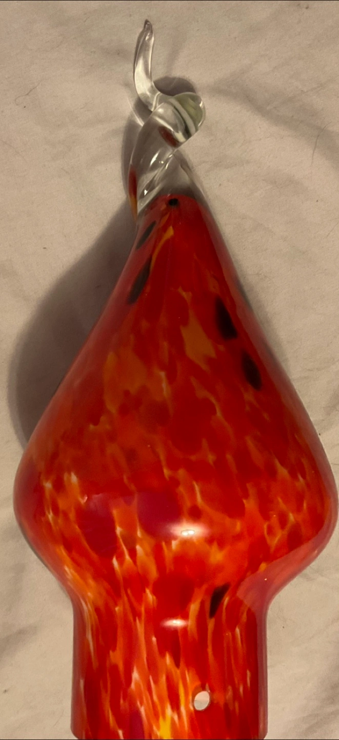 Hand-blown glass for light fixture/ light bulb cover Featuring red and orange hues, black spots, and a clear, twisted top. Lovely for adding a sense of peace to any space. Never used no box