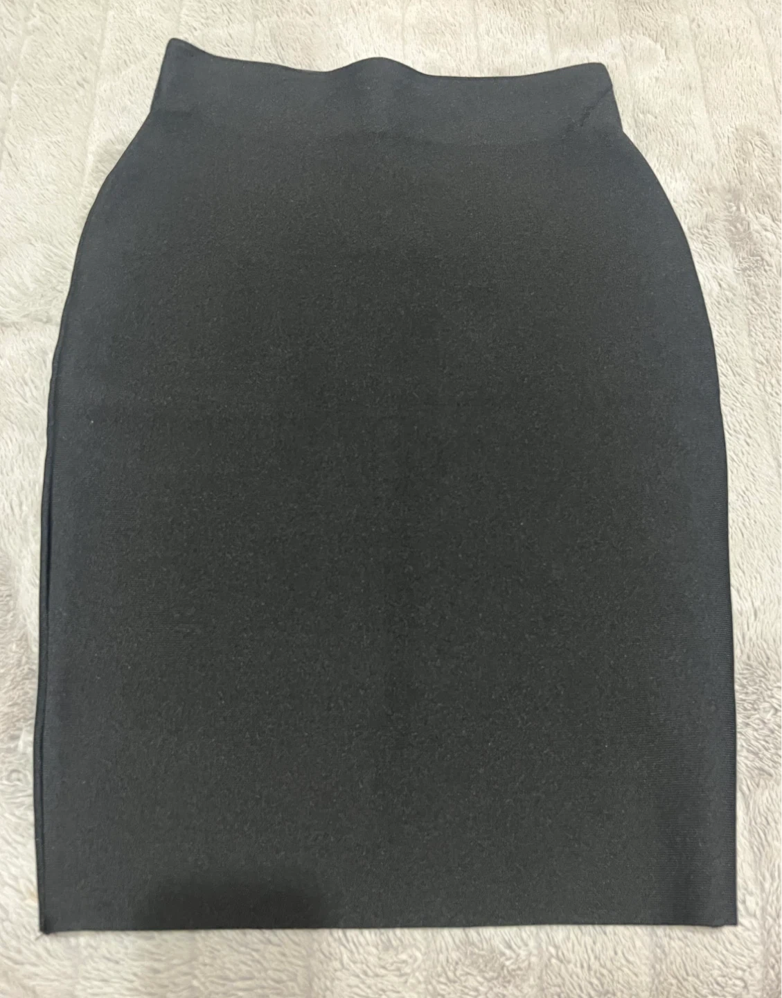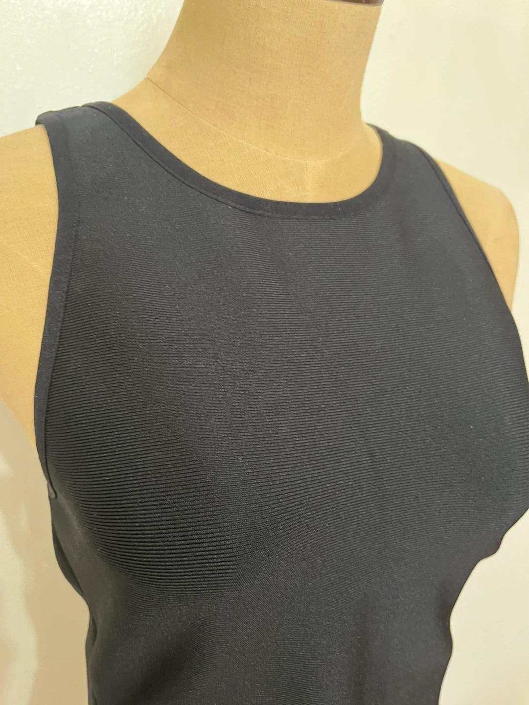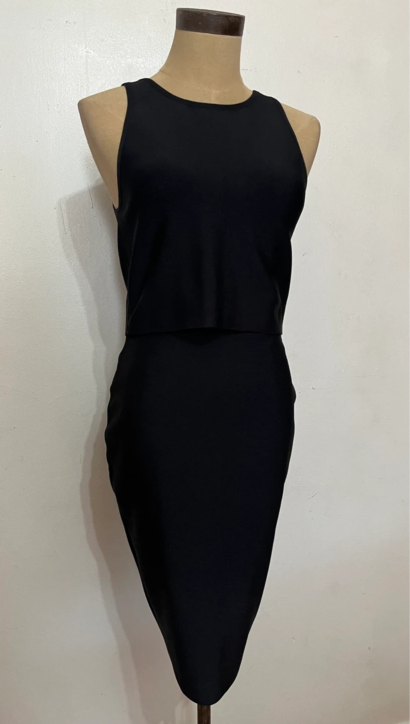This black tank top and skirt set is a size medium, but very very fitted. Very form fitting and is more like a size small. The material is stretchy and ribbed. Never worn.