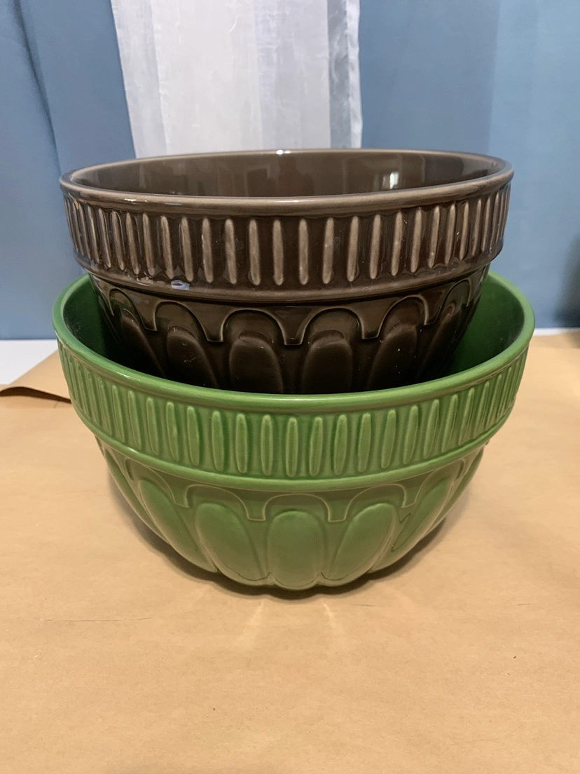 Two mixing/serving bowls, one green and one brown, with raised details around the rim and body. The bowls are made of stoneware and are microwave and dishwasher safe. Made in China.