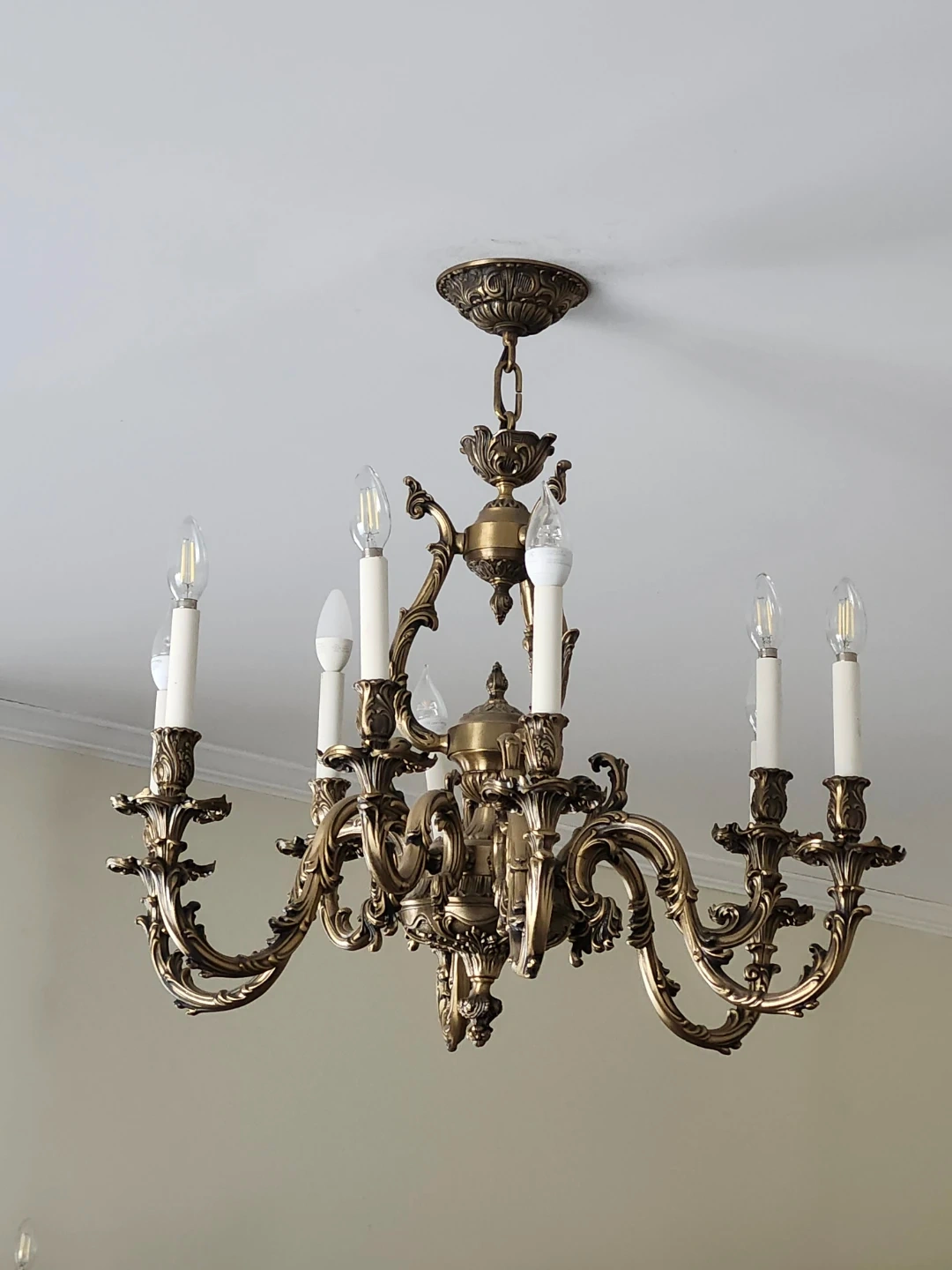 Elegant vintage brass chandelier with ornate detailing. It has 8 arms, each holding a candle-style bulb. This chandelier provides a warm and classic ambiance.