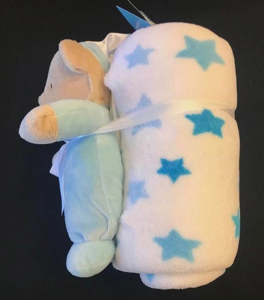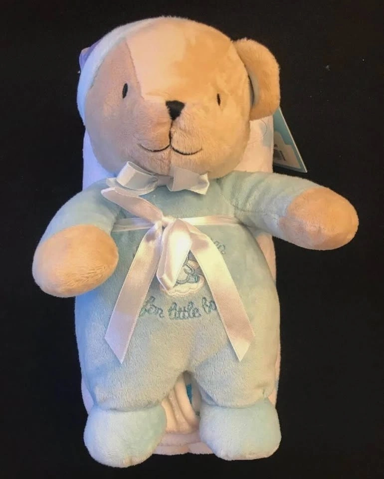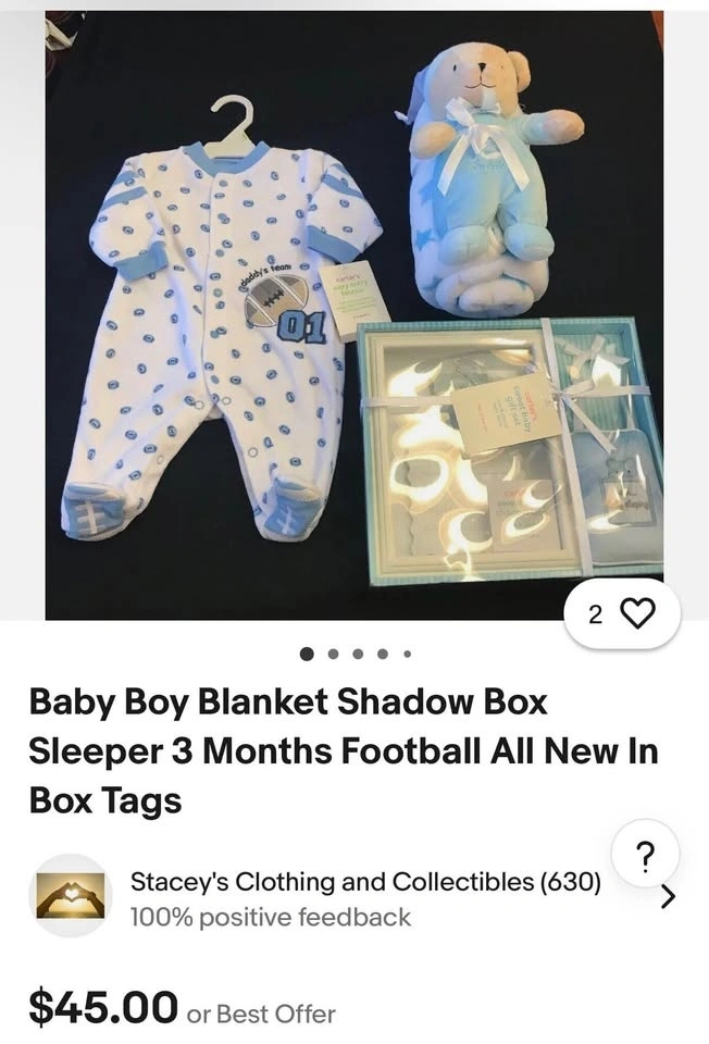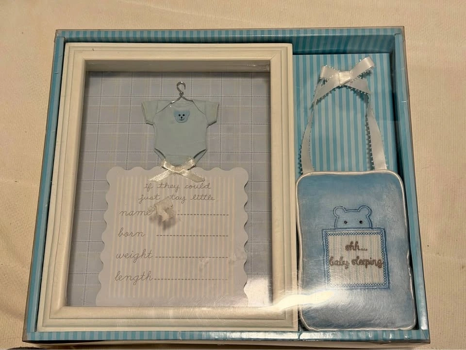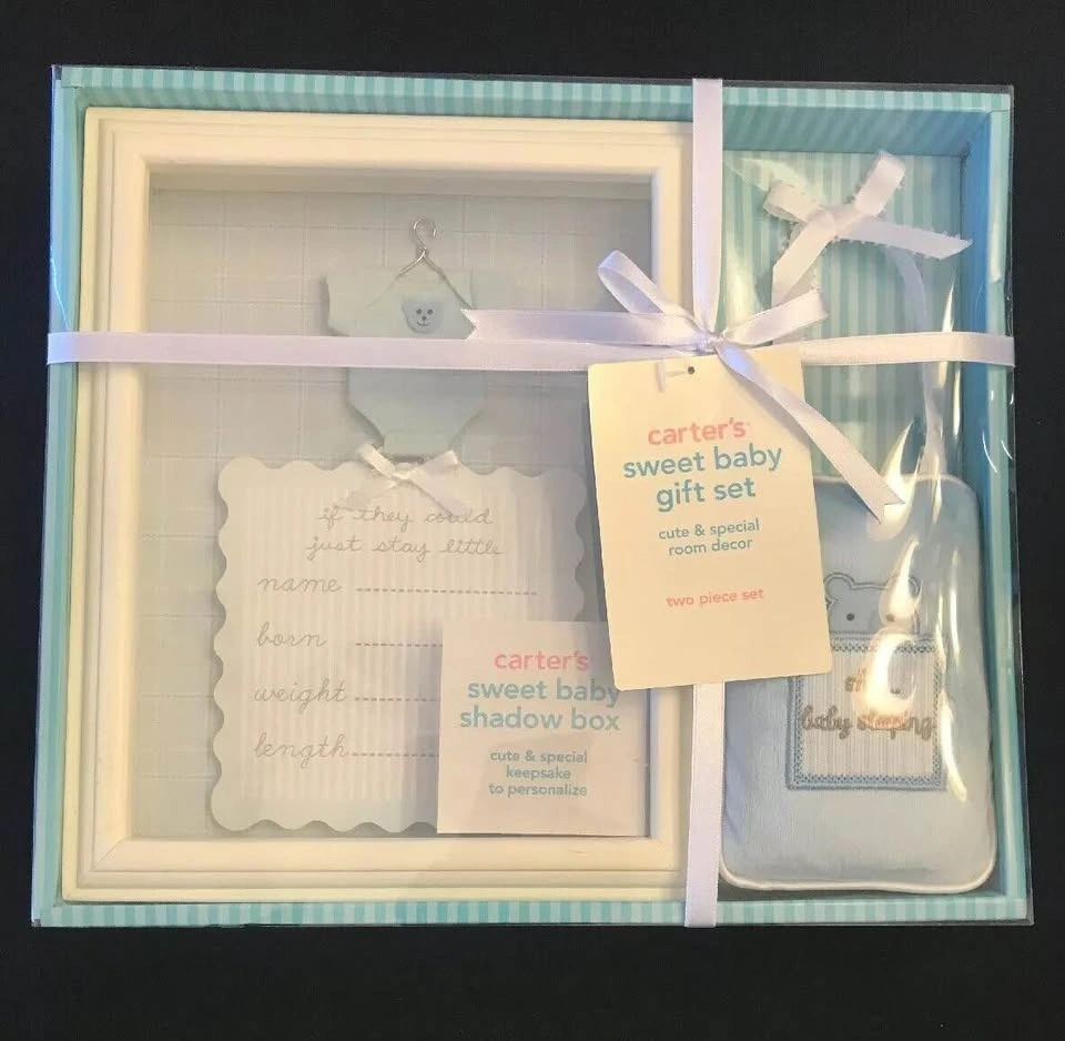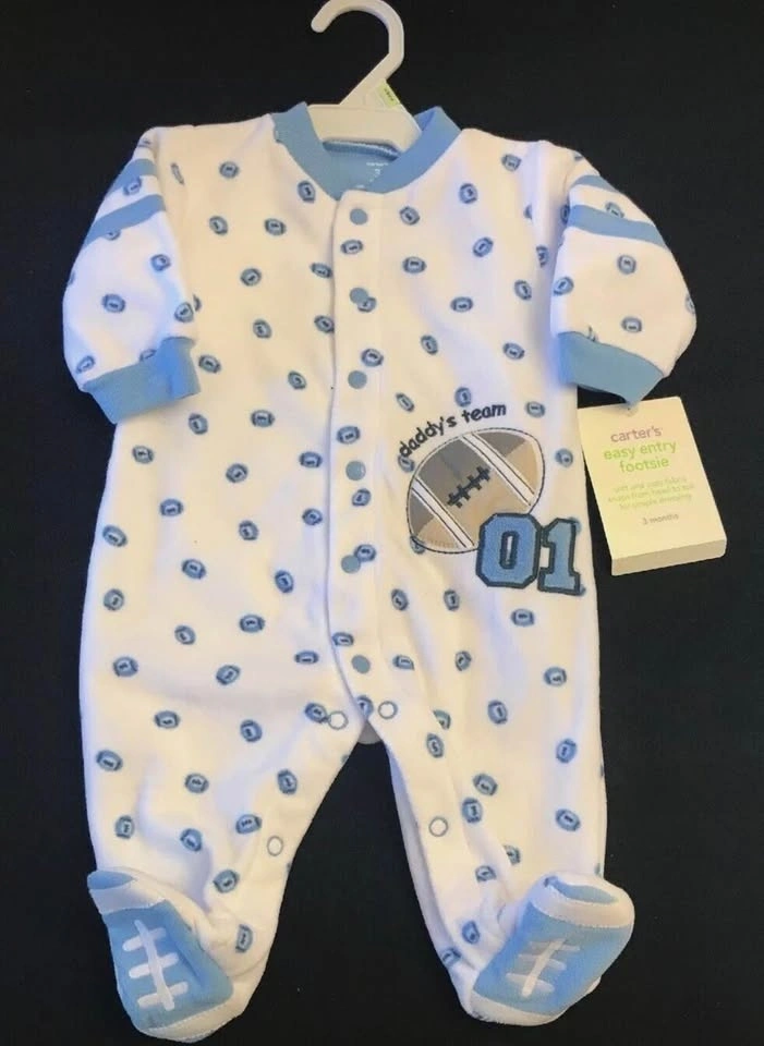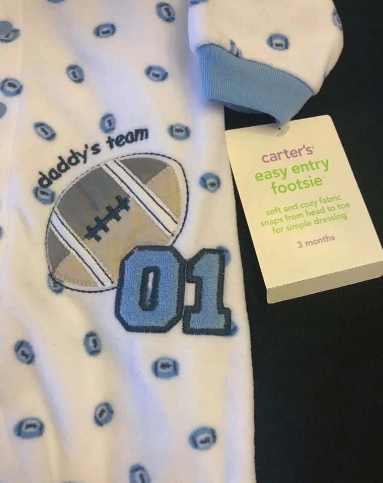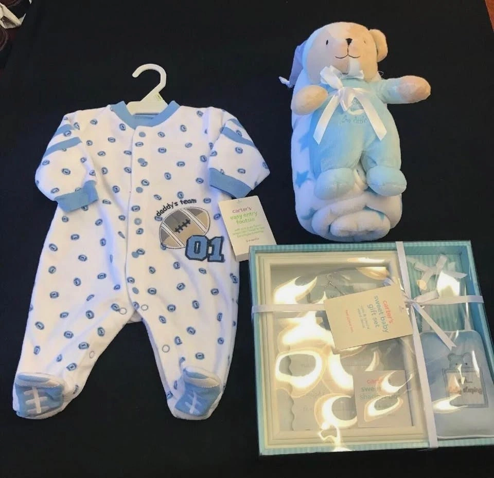 Adorable baby boy bundle featuring a Carter's sweet baby gift set with a shadow box for birth details and a 'shh... baby sleeping' plush. Also includes a Carter's 'Daddy's Team' football sleeper, size 3 months, and a cute blue plush teddy bear wrapped in a star blanket. All items are new with tags.