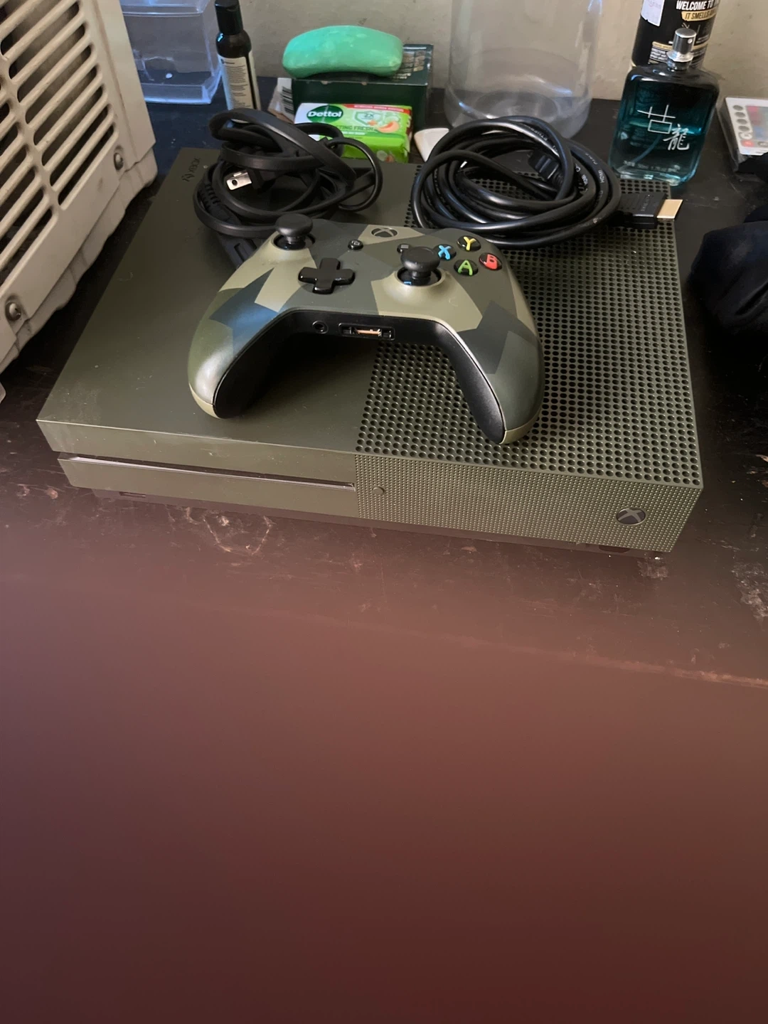 This is an Xbox One S console in a dark green color. It comes with a camouflage-patterned controller. Cables are included for setup. It's ready for gaming!