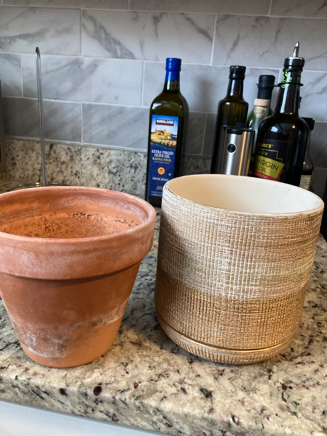 One terracotta pot with a matching decorative planter. The planter features a textured design in natural tones. Perfect for displaying your plants indoors or outdoors!