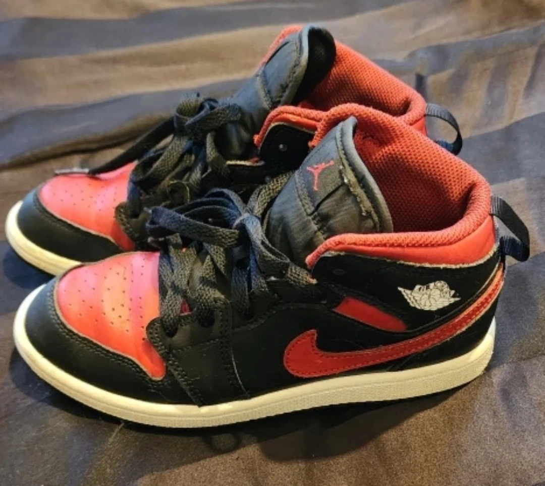 Jordan sneakers for children in US size 2Y. They feature a classic design with a black and red color combination. They are in good condition.