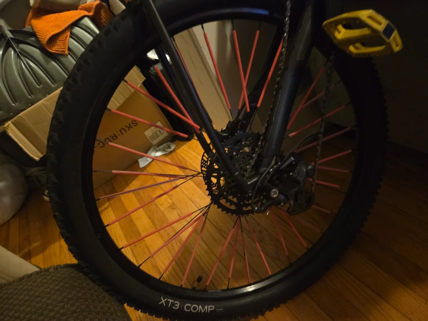 Selling a Chucks Ridder XT3 Comp bike. It features black tires with red spokes and yellow pedals. Great for getting around town!