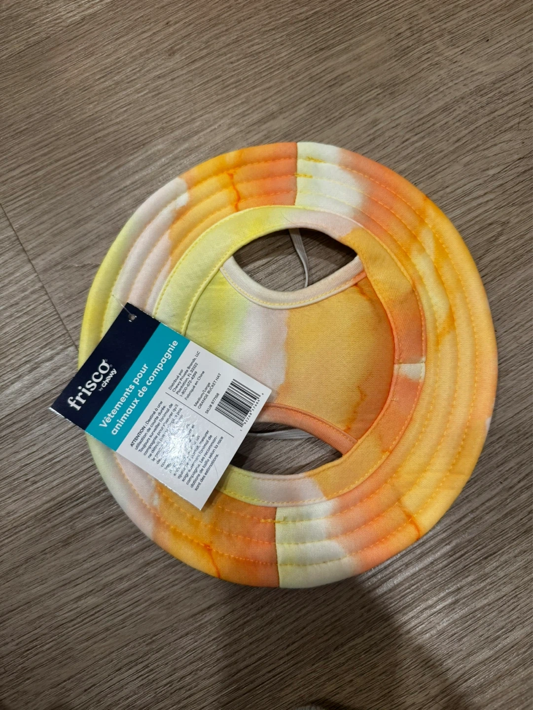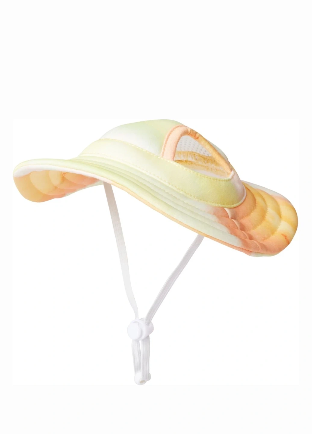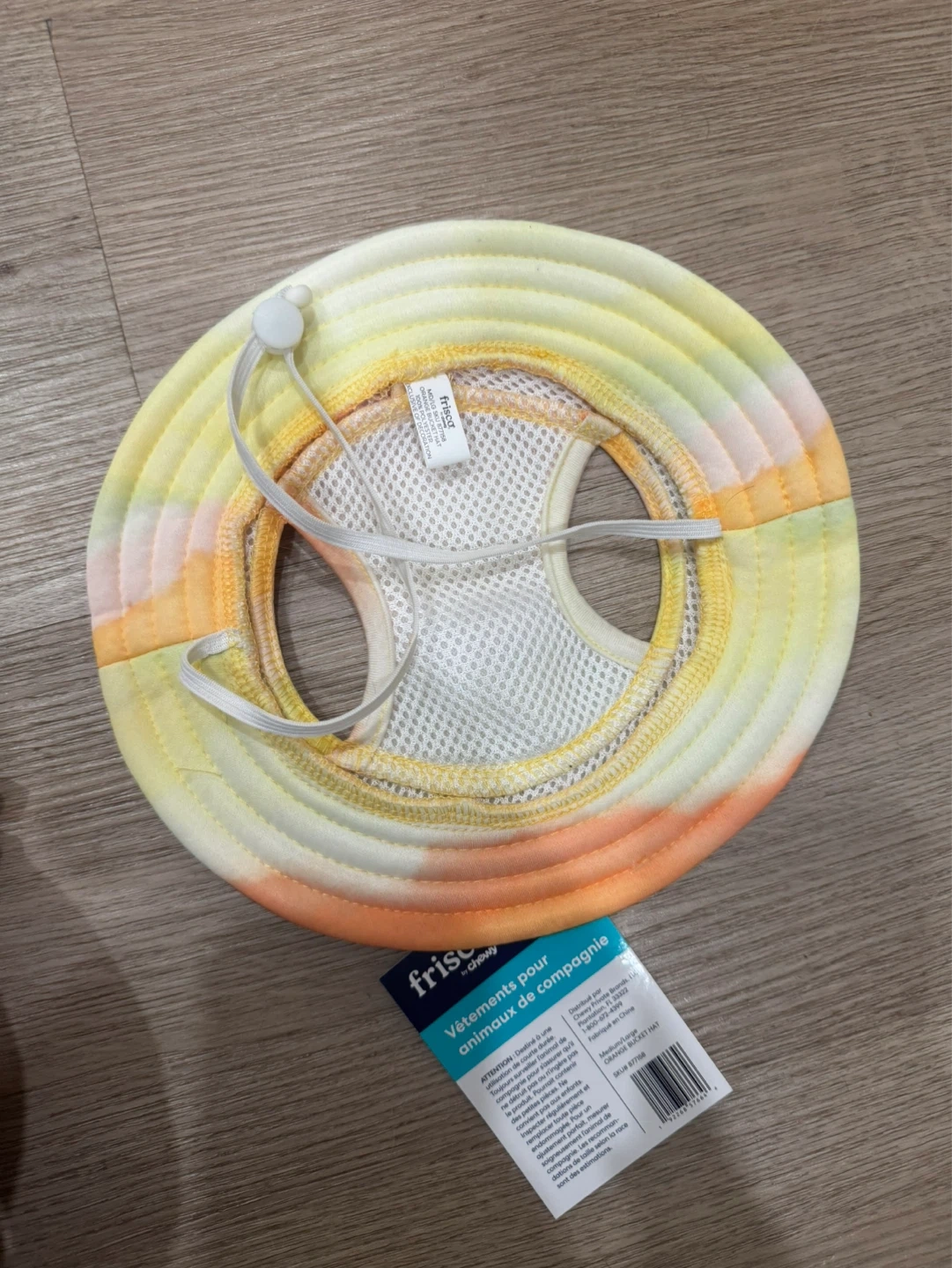 This cute dog hat features a tie-dye pattern in yellow, orange, and white. It has ear holes for comfort and an adjustable chin strap. It's made with breathable mesh lining.