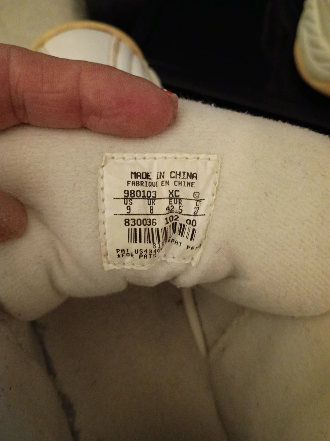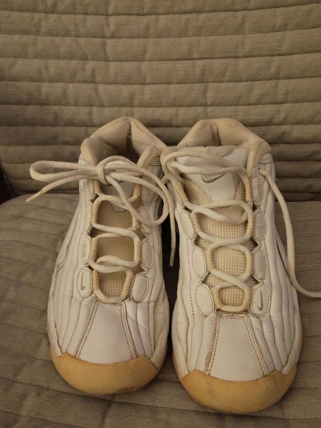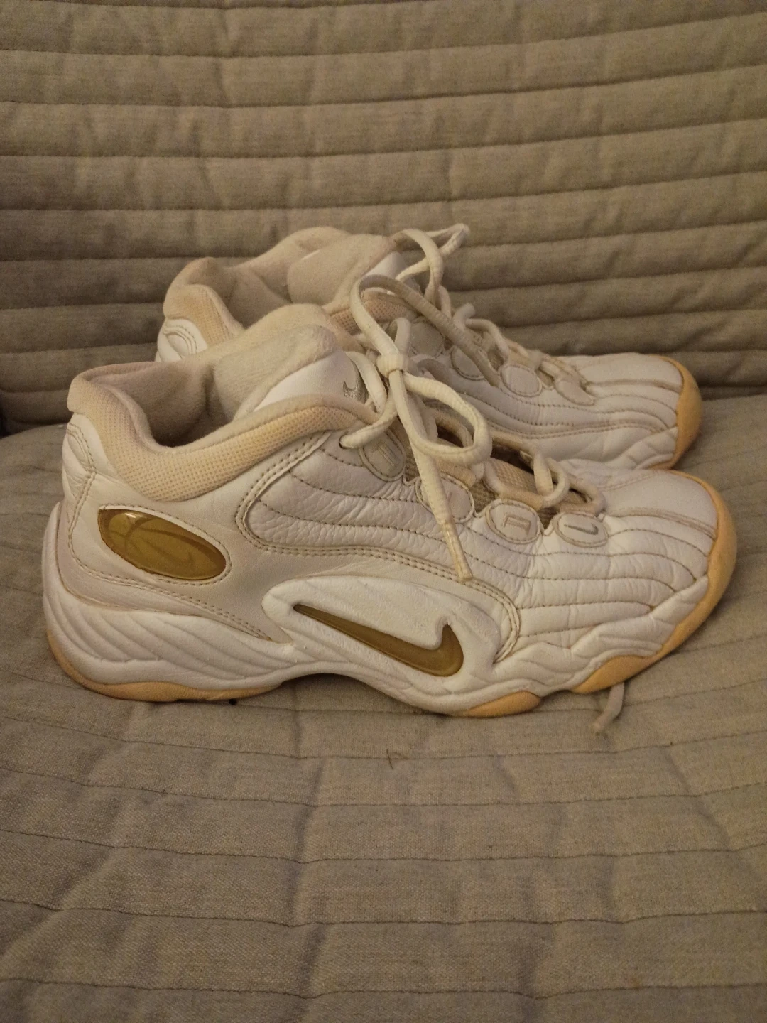 Selling a pair of Nike sneakers. They are a US size 9 and have a white and gold color scheme. Please take a look at the pictures for the exact condition!